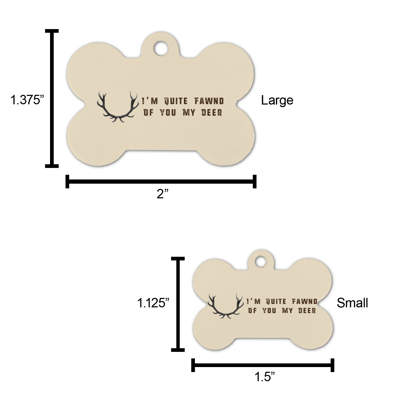 The small bone dog tag size is perfect to pair with our small dog collars, the large size pairs well with our large dog collars.