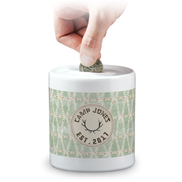 This coin bank is a fun way to decorate a nightstand or a dresser. The bank is a cylindrical shape and is made of ceramic. On the bottom it has a hole big enough for coins to fall out of easily with a rubber plug to stop them from falling when on display. On the top of the bank there is a large slit big enough to slide your coins through with ease. The coin bank measures at approximately 3.75" x 3.25".