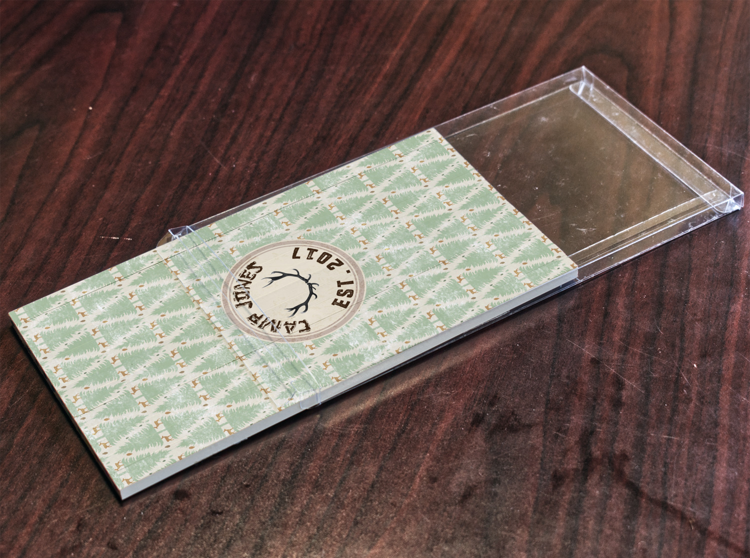 This design has a very calm color palette with toned down greens and tans. On the main pattern you will find adorable little deer in between rows of pines.