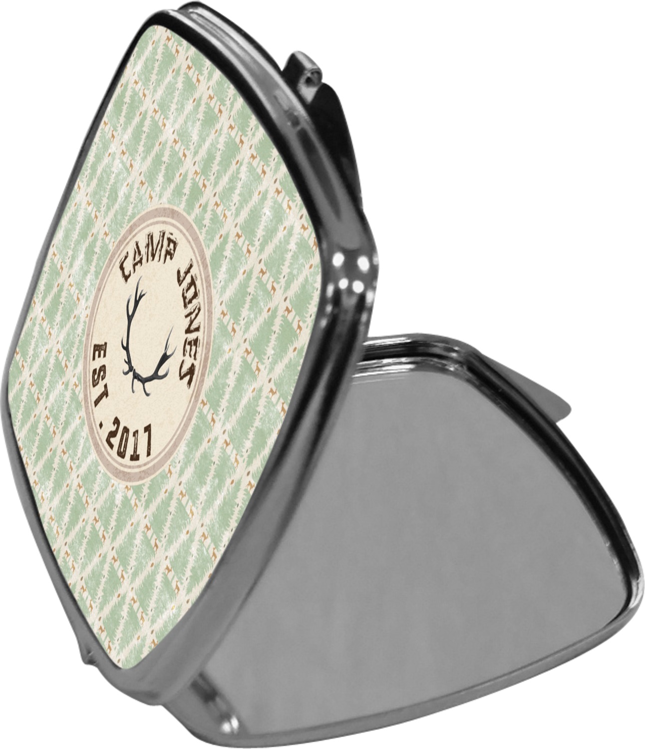 Our compact mirrors are customized with your design on one side. The other side is patterned silver tone metal. Inside, there are two mirrors.