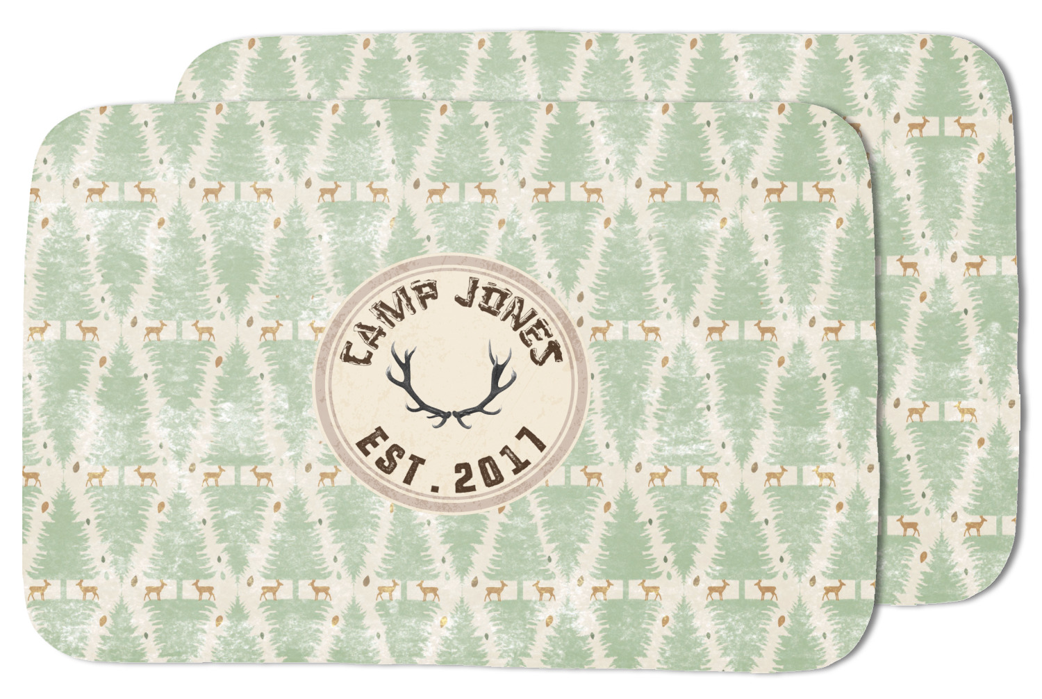 This design has a very calm color palette with toned down greens and tans. On the main pattern you will find adorable little deer in between rows of pines.
