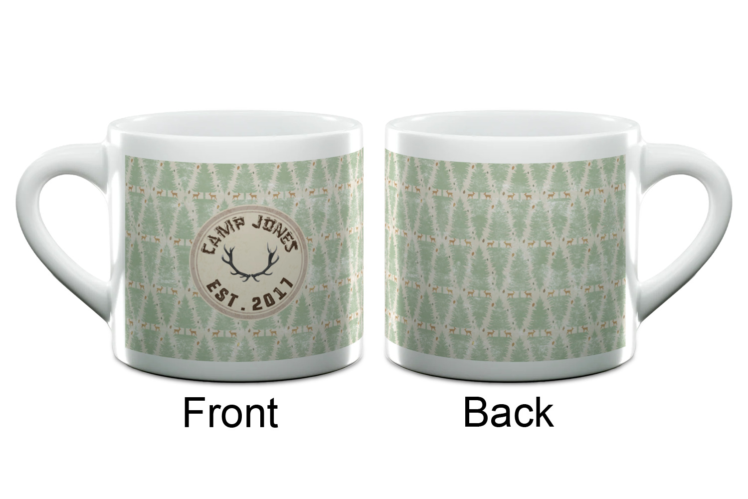 Each of our espresso mugs is a ceramic material sure to keep your drink warm. Personalize one cup for yourself, or order a set of 4! Its the perfect little gift for any coffee lover! We carry two sizes for you to personalize - 3 oz. (approx. 3.25" x 2.325" x 2.625") or 6 oz. (approx. 4" x 2.9" x 2.9"). Our 3 oz. mug is perfect for that single shot espresso while our 6 oz. mug can be your next favorite cappuccino cup holding two shots of espresso!