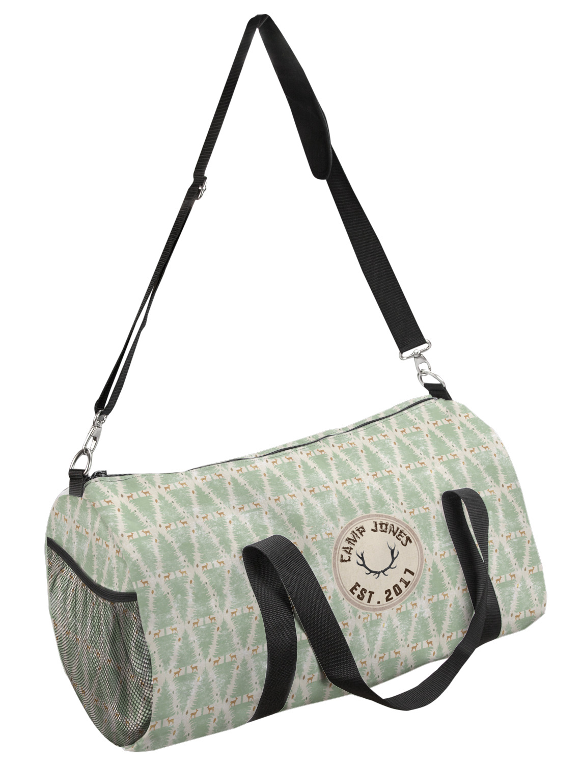 This duffle is a sturdy bag made of a canvas material. It comes in two sizes: Small (19"W x 9.5"H x 9.5"D) and Large (23"W x 12"H x 12"D). The bag is a cylindrical shape with a black adjustable strap and two handles. On one side is an elastic pouch to put a waterbottle or other small item. Your product will be sublimated with your design and is able to be designed on the front, back, and sides. Be sure to remember that the straps may cut into parts of your design if you upload your own artwork.
