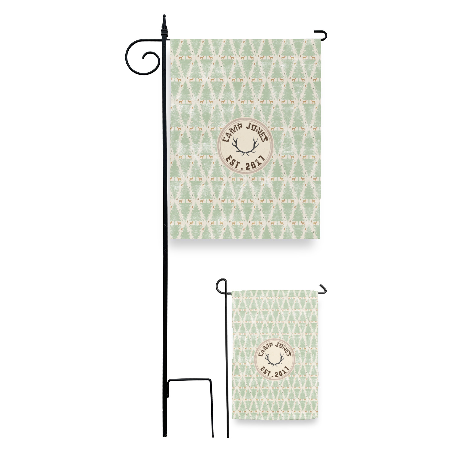These custom garden flags are made of a durable, double-ply, polyester weave, allowing them to withstand the elements year round. The small flags measure at approximately 12 by 18 inches. The large flags measure out to 28 by 37 inches. You can order these decorative flags with your customization printed on the front only, or the front and back.