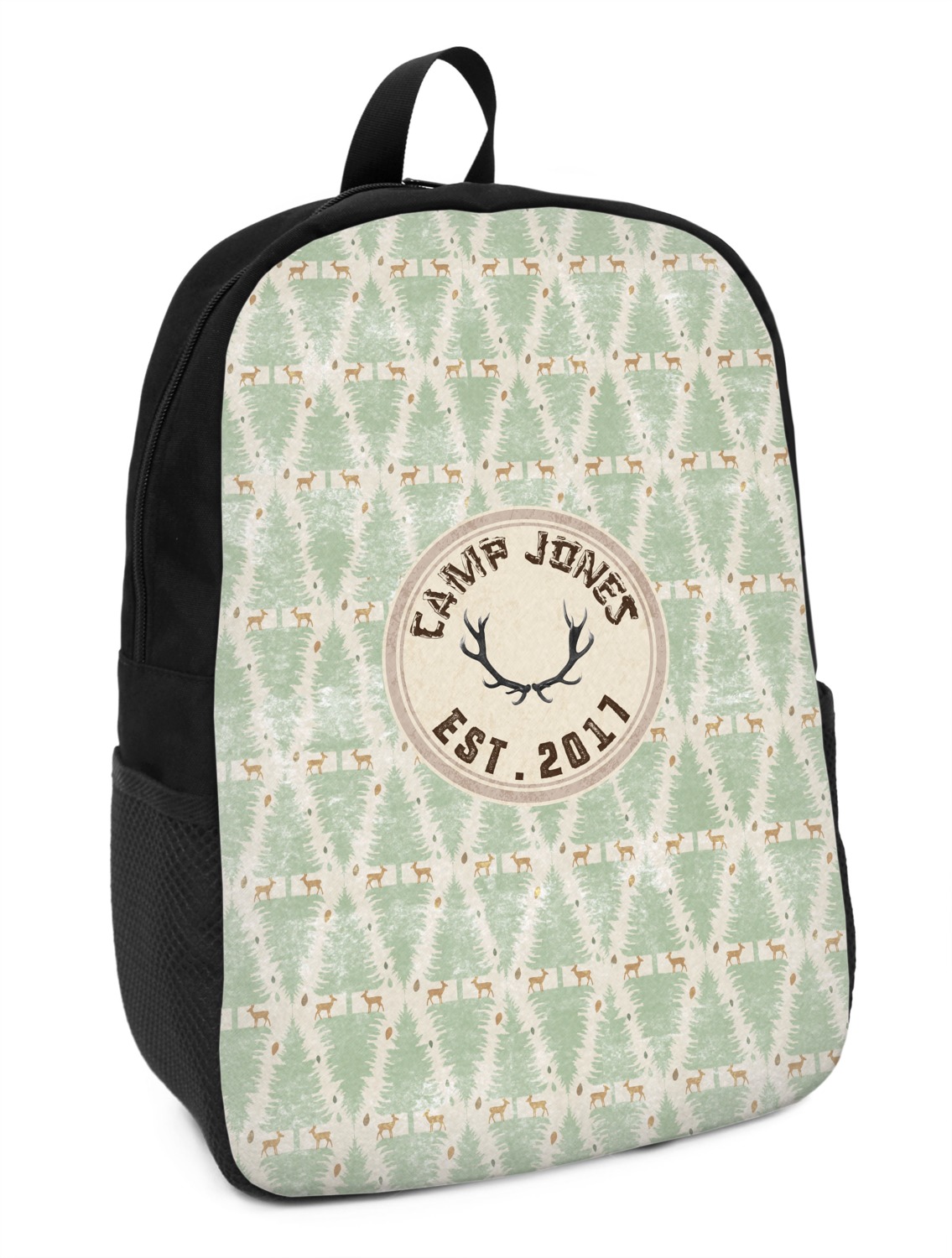 These small backpacks are made of a durable black canvas material with your personalization right on the front. The two shoulder straps are padded and easily adjustable. The bag itself measures at about 11" W x 15" H x 5" D. It's the perfect size for elementary aged kids or adults who want a smaller backpack. On the top of the bag you will find a handle to hang or carry your backpack by as well as a large zipper closure to keep all of your belongings safe inside. On each side of your backpack is a mesh pocket for a small item or water bottle. Inside your backpack you will find a spacious area with a small zipper pocket and a padded laptop slot that will fit up to a 13" laptop (13" being very snug). This is the perfect bag for any student that needs a couple books and their laptop with them at all times. It also works great as a carry on for traveling!