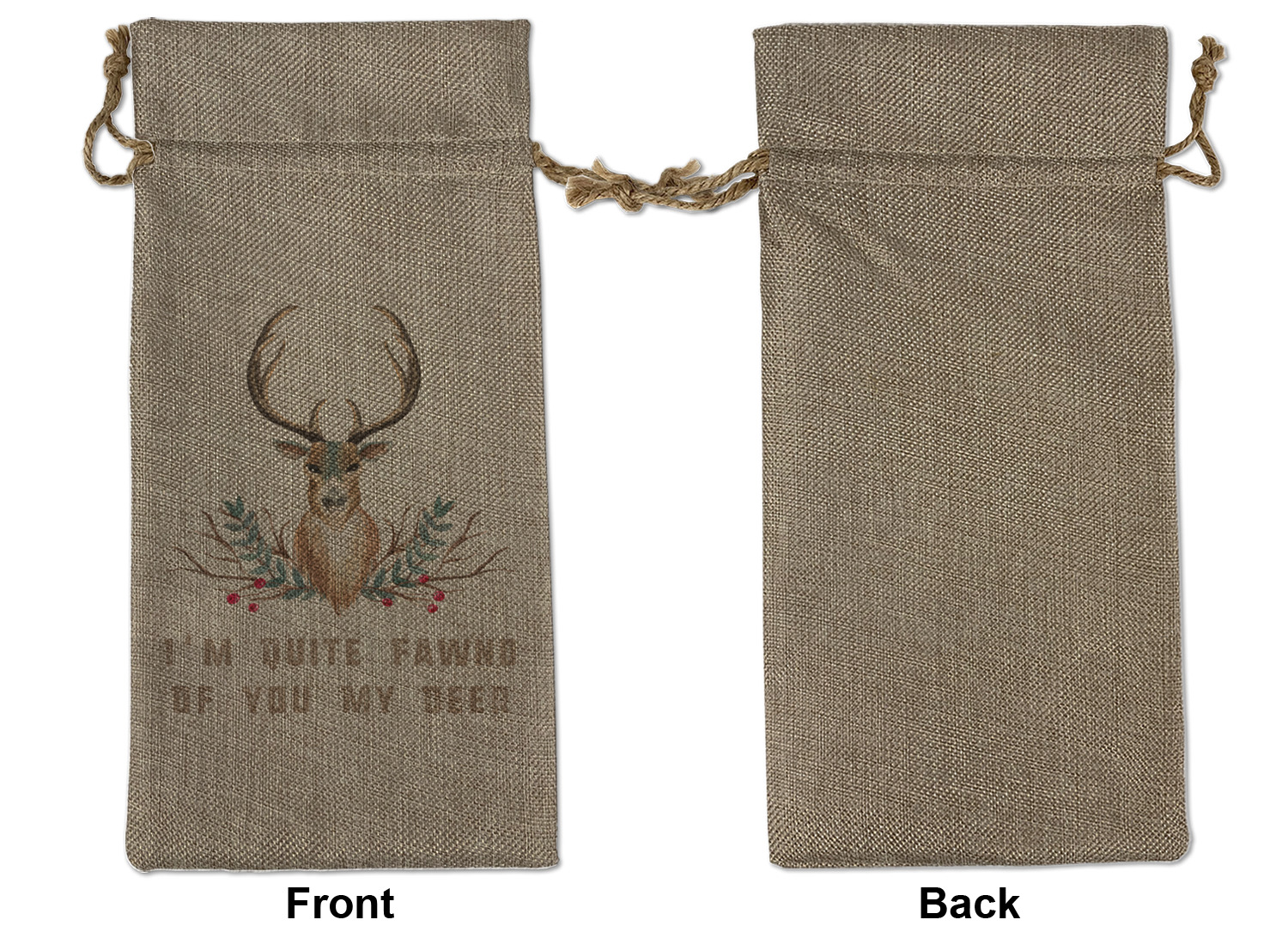 We sell our Burlap Gift Bags in 3 variant sized bags. Made with burlap polyester, each personalized bag can be secured with a twine drawstring pull. Your custom design is available to print on one side or both sides - completely up to you! The sizes of the bags measure approximately 4.5" x 6.5" for the smallest size, 6.5" x 8.0" for the medium size, and 6.5" x 13.5" for the large-sized bag.