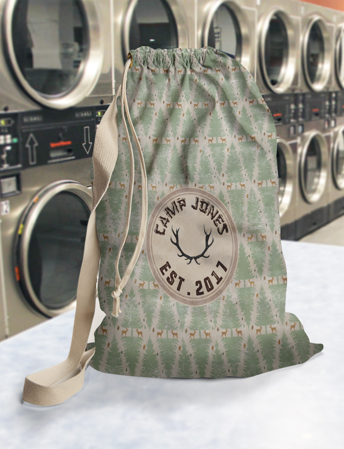 Carry your laundry in style with these customized laundry bags. Available in two sizes, featuring a natural colored woven strap and a cinch cord, these bags hold a lot of clothes or anything else you want to fit in them.
