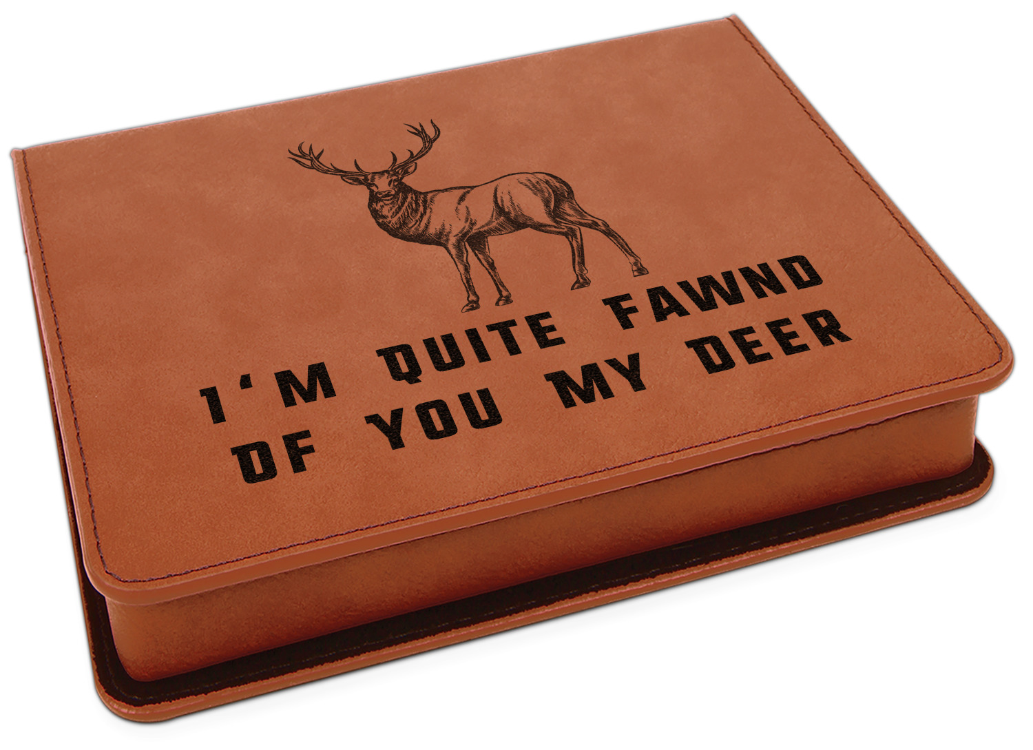 This set includes a wine stopper, pourer, drip ring, and a corkscrew! The exterior of the box is a gorgeous, cognac-brown leatherette, while the interior is covered in a black, velvety material. Four foam indentations, unique to the shape of the wine tool, are found at the bottom half of the box's interior. The tools fit snugly into each of their designated spots, and the foam material helps to protect the integrity of your tools. Each of the wine gadgets features a bamboo accent, with the location and style depending on the tool itself. We laser engrave your personalized design onto the lid of the box, which easily flips open and is secured closed by a small magnet. The wine accessories box measures at 7 by 5.5 inches in total.