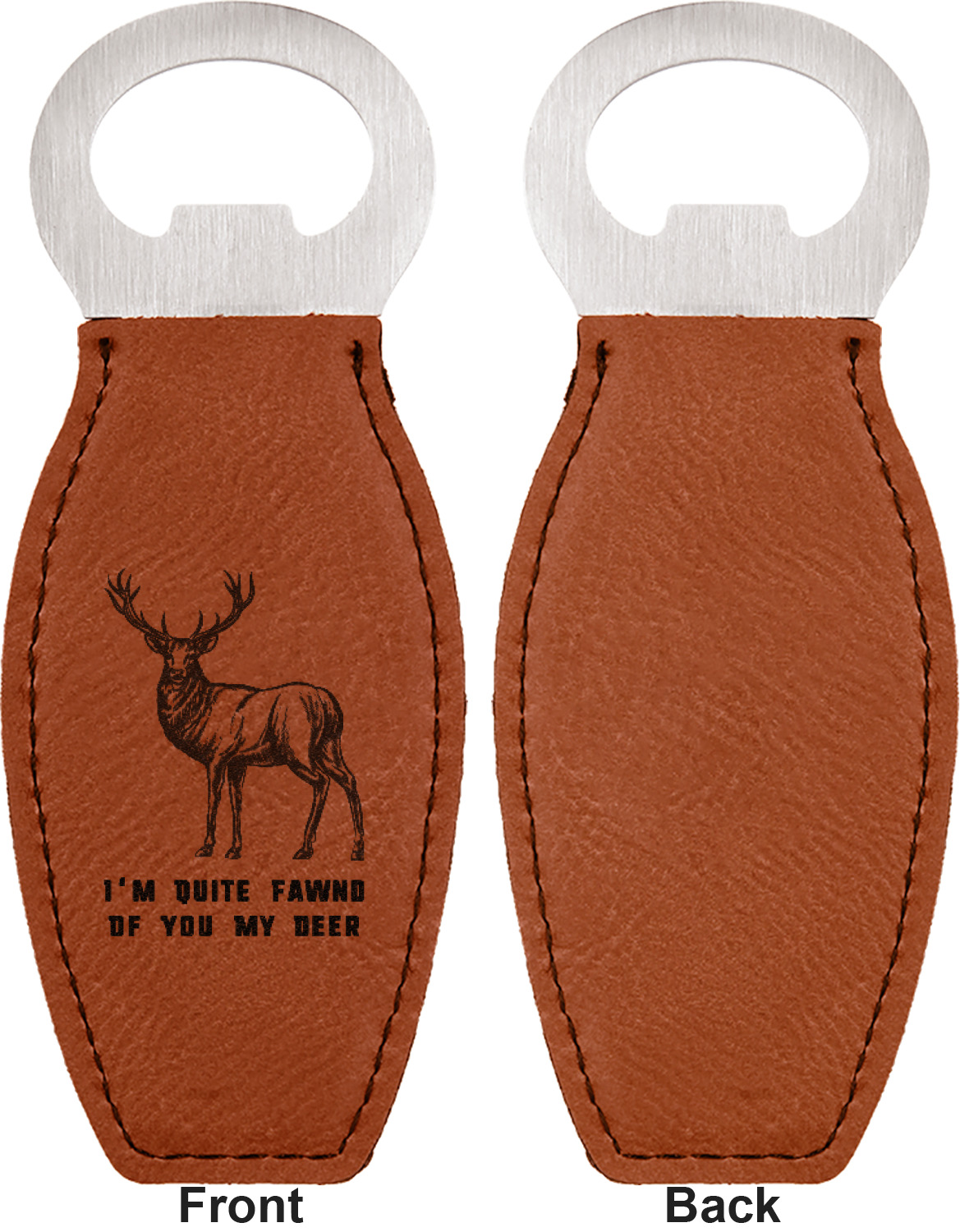 Built from stainless steel, these custom bottle openers are wrapped in a cognac-colored leatherette. Sharp, black stitching lines the edges for extra durability and a finished touch. Your personalization is laser-engraved onto the surface of this leatherette, leaving behind a crisp, black coloration. At 4.6 by 1.8 inches, this beer bottle opener gives you much of leverage when trying to open a stubborn bottle. On the opposite end of the opener, you'll find a magnet that you can use to display your new, unique bottle opener!