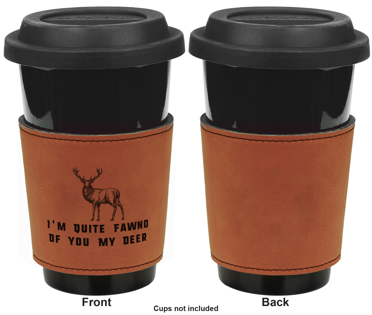 This cup sleeve is made from a suave, cognac-brown leatherette and finished with an intricate, black stitch. The interior of this can sleeve is fabricated from a thin foam material to help insulate your mug's contents. The sleeve is specifically made to suit tapered glasses or mugs, so the top's diameter is 3.5 inches, while the bottom's diameter is 2.75 inches. Your customized design will be laser engraved into the leatherette, leaving behind crisp, black imprint. With these products, we provide you with the option of engraving the front and back, or the front only.