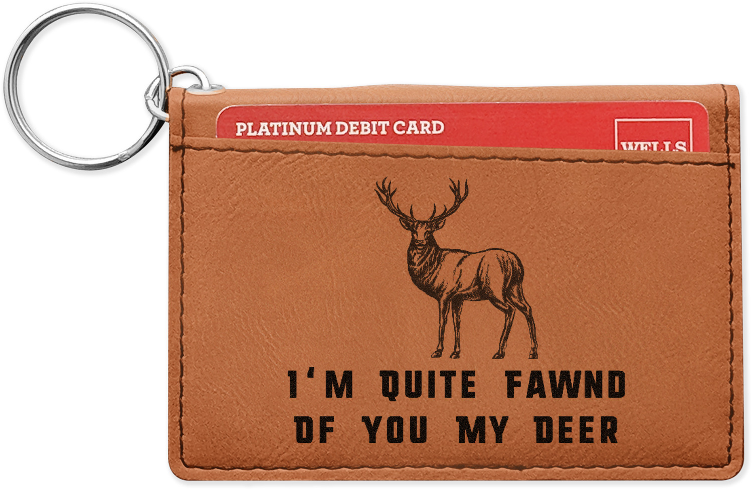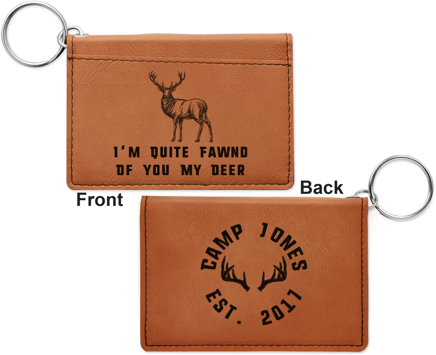 These ID wallet keychains features three pockets on the inside to accommodate your ID and your most frequently used cards. Another pocket occupies the front of the wallet's exterior, and can hold some cash or another card. The wallet is accompanied by a thick metal ring for easy attachment to a belt clip or purse. Each card holder keychain measures at 4.25 by 3 inches and is a beautiful, cognac, medium-brown shade. The personalized monogram, font, or graphic of your choosing is laser engraved into the surface of the wallet, creating a black imprint. We sell these ID wallets in two models: single sided and double sided engraving.