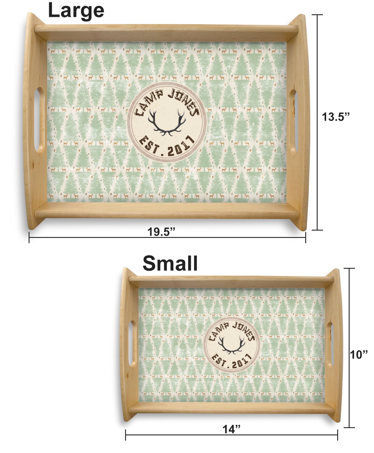 This serving tray with handles features square edges and two rounded sides, creating a very modern look. Each side is fabricated from a beautifully cut, natural wood. The bottom of the interior of the tray displays your customized design in bright, vibrant color. The tray is sold in both a black color and a natural wood look. Each variation of the wood serving tray has two sizes: Small, which is 14" x 10" x 2.25", and Large, which is 19.5" x 13.5" x 2.75".