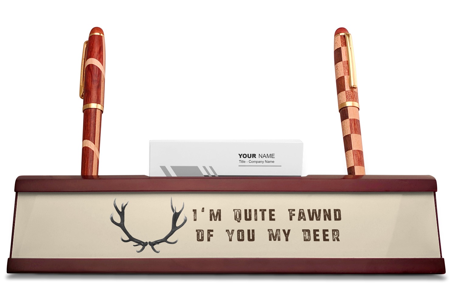 Your desk name plates are crafted from a high-quality, dark-cherry mahogany. At approximately 9.5 by 1.875 by 2.5 inches, this name plaque will fit perfectly, front and center, on your desk. Your customization spans across the entire face of the nameplate. Behind the nameplate lies a skinny slot that can fit approximately 15, traditionally-sized, business cards. You can also store your writing utensils on either side of this custom desk name plate.