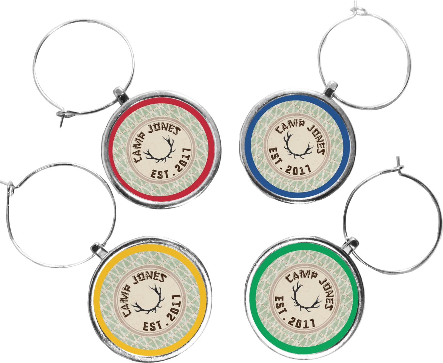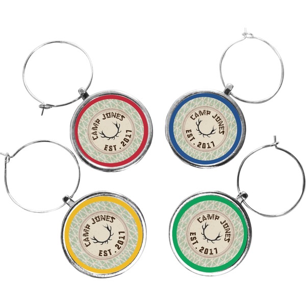 Your wine glass markers are comprised of a circular zinc plate with a 1.25 inch diameter. The zinc plate hangs from a zinc loop, which can be easily secured and removed from the stem of a wine glass. Your customized design is printed onto a 1 inch diameter insert, and then placed into the wine glass charm itself. Though sold in a set of four, you can personalize each charm individually and change the colors of the ring around your design, depending on your needs.