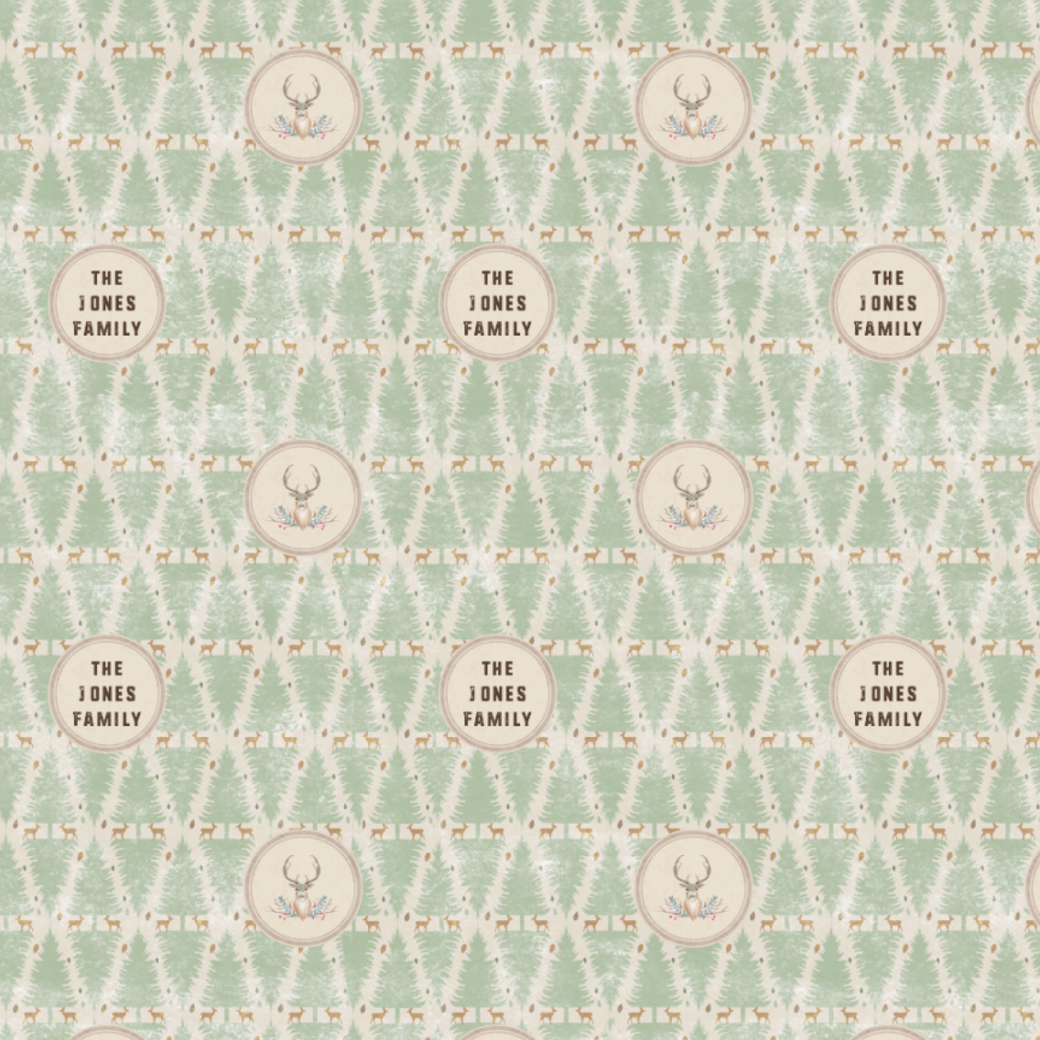This design has a very calm color palette with toned down greens and tans. On the main pattern you will find adorable little deer in between rows of pines.