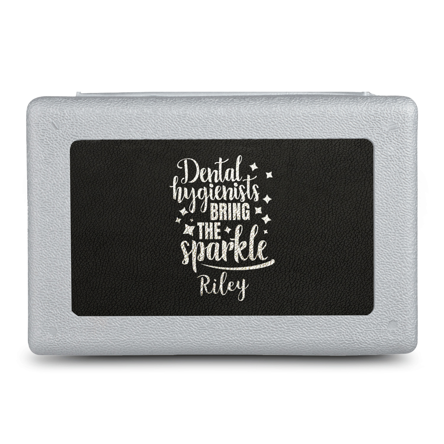 For the foreground, we used a fun quote that says "Be nice to me, I control sharp instruments #dental hygienist"Dental Hygienists bring the sparkle". We chose to personalize it with a name underneath. We used black for our color. You can customize the graphics, the colors as well as the personalization. Enjoy customizing it to make it yours.