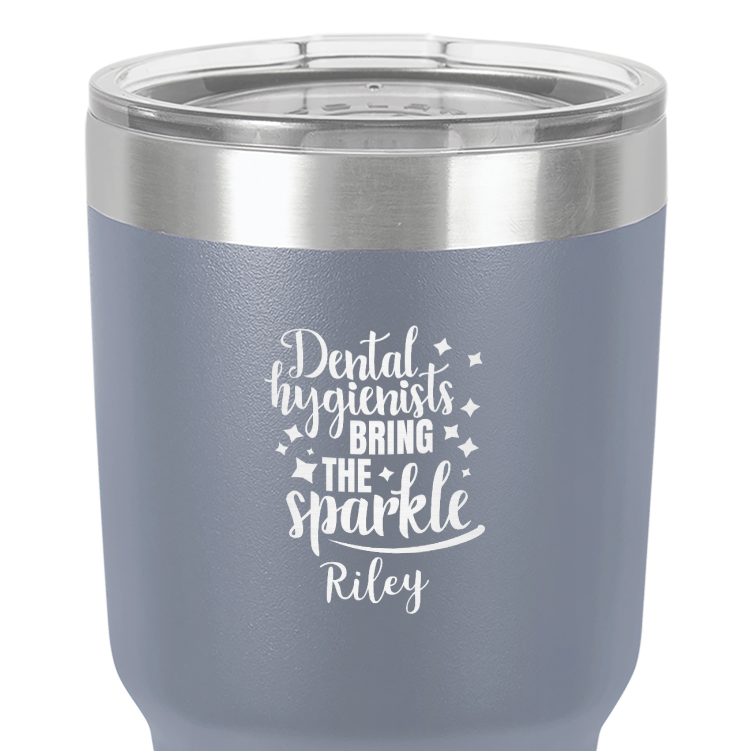 For the foreground, we used a fun quote that says "Be nice to me, I control sharp instruments #dental hygienist"Dental Hygienists bring the sparkle". We chose to personalize it with a name underneath. We used black for our color. You can customize the graphics, the colors as well as the personalization. Enjoy customizing it to make it yours.