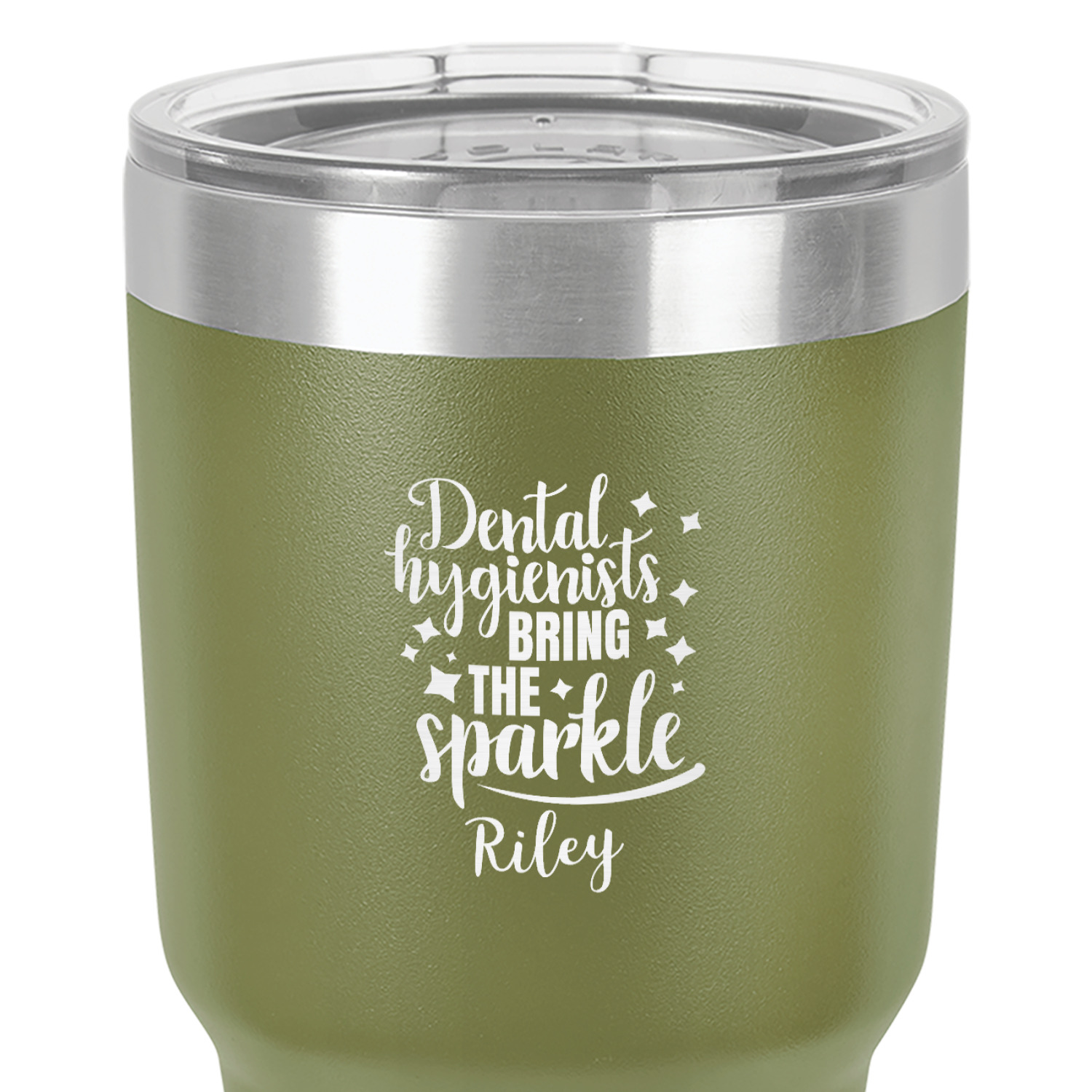 For the foreground, we used a fun quote that says "Be nice to me, I control sharp instruments #dental hygienist"Dental Hygienists bring the sparkle". We chose to personalize it with a name underneath. We used black for our color. You can customize the graphics, the colors as well as the personalization. Enjoy customizing it to make it yours.