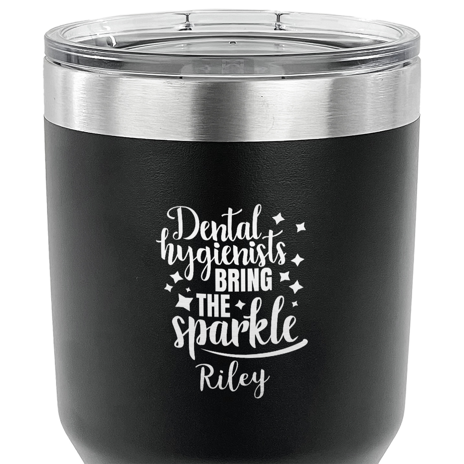 For the foreground, we used a fun quote that says "Be nice to me, I control sharp instruments #dental hygienist"Dental Hygienists bring the sparkle". We chose to personalize it with a name underneath. We used black for our color. You can customize the graphics, the colors as well as the personalization. Enjoy customizing it to make it yours.