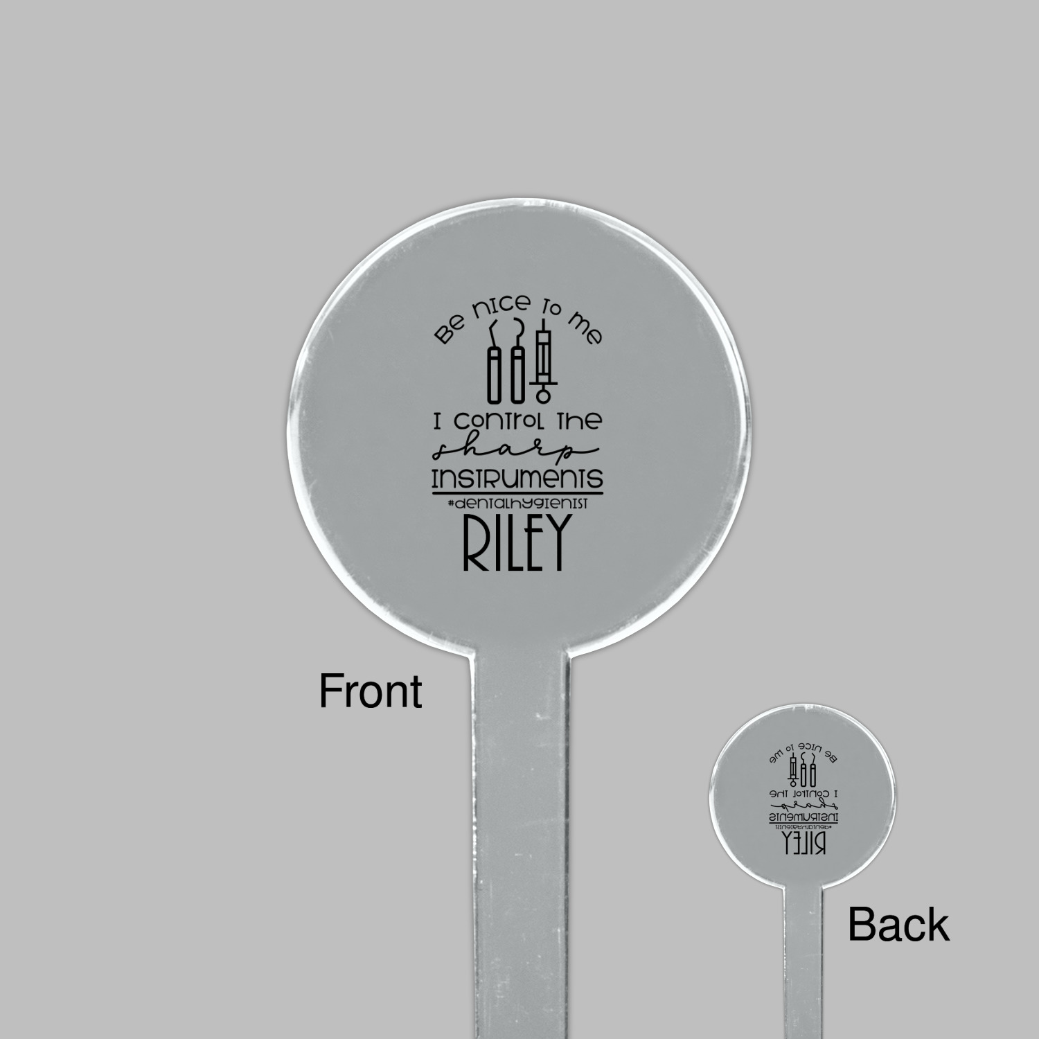For the foreground, we used a fun quote that says "Be nice to me, I control sharp instruments #dental hygienist"Dental Hygienists bring the sparkle". We chose to personalize it with a name underneath. We used black for our color. You can customize the graphics, the colors as well as the personalization. Enjoy customizing it to make it yours.