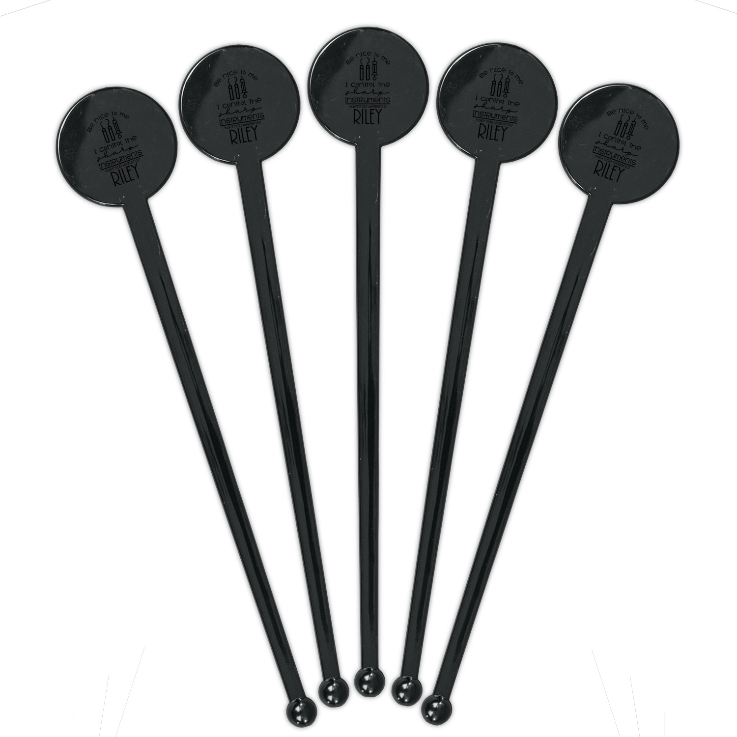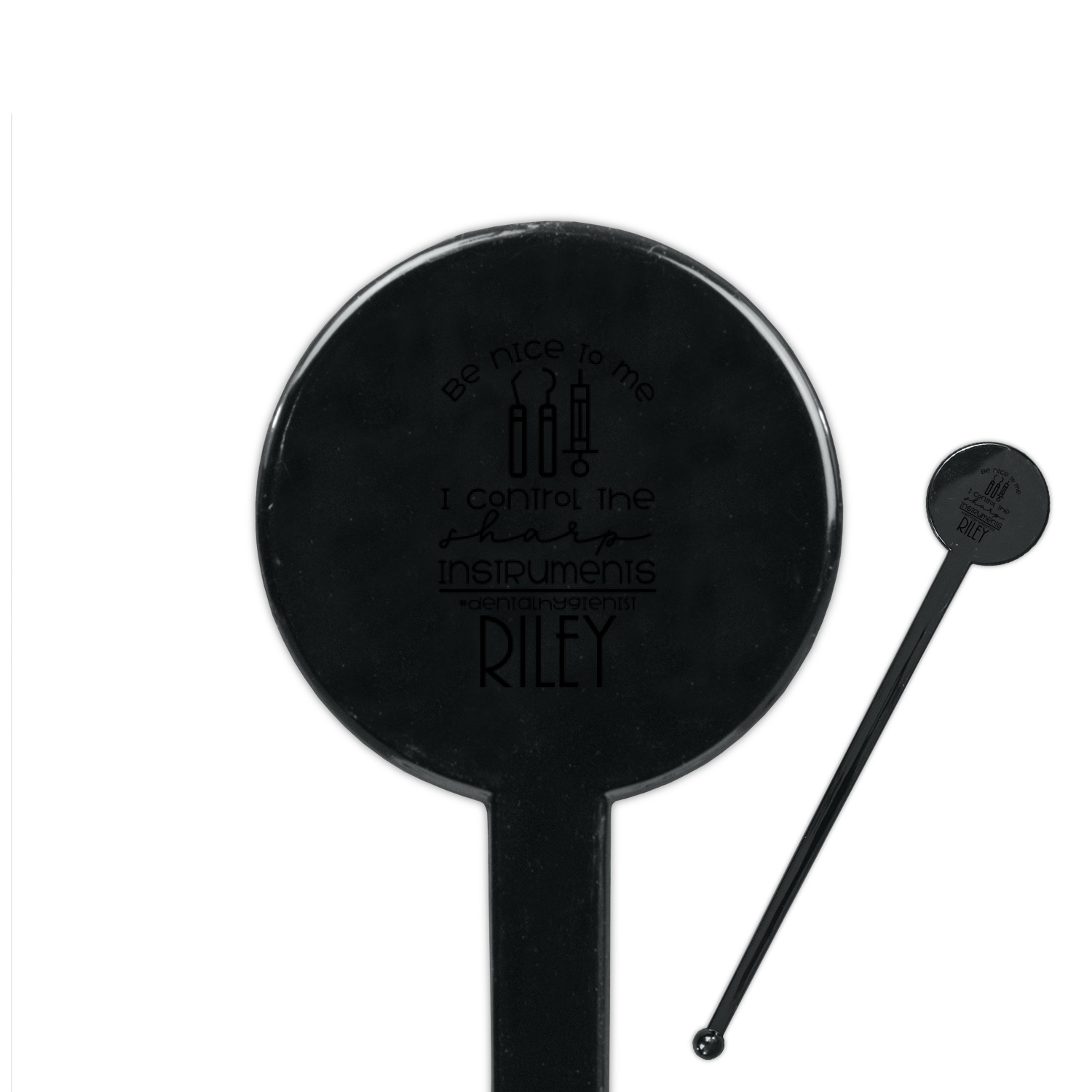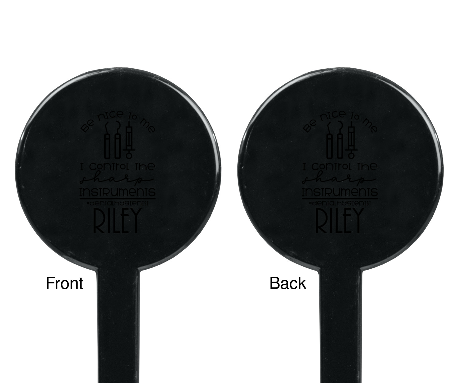 For the foreground, we used a fun quote that says "Be nice to me, I control sharp instruments #dental hygienist"Dental Hygienists bring the sparkle". We chose to personalize it with a name underneath. We used black for our color. You can customize the graphics, the colors as well as the personalization. Enjoy customizing it to make it yours.