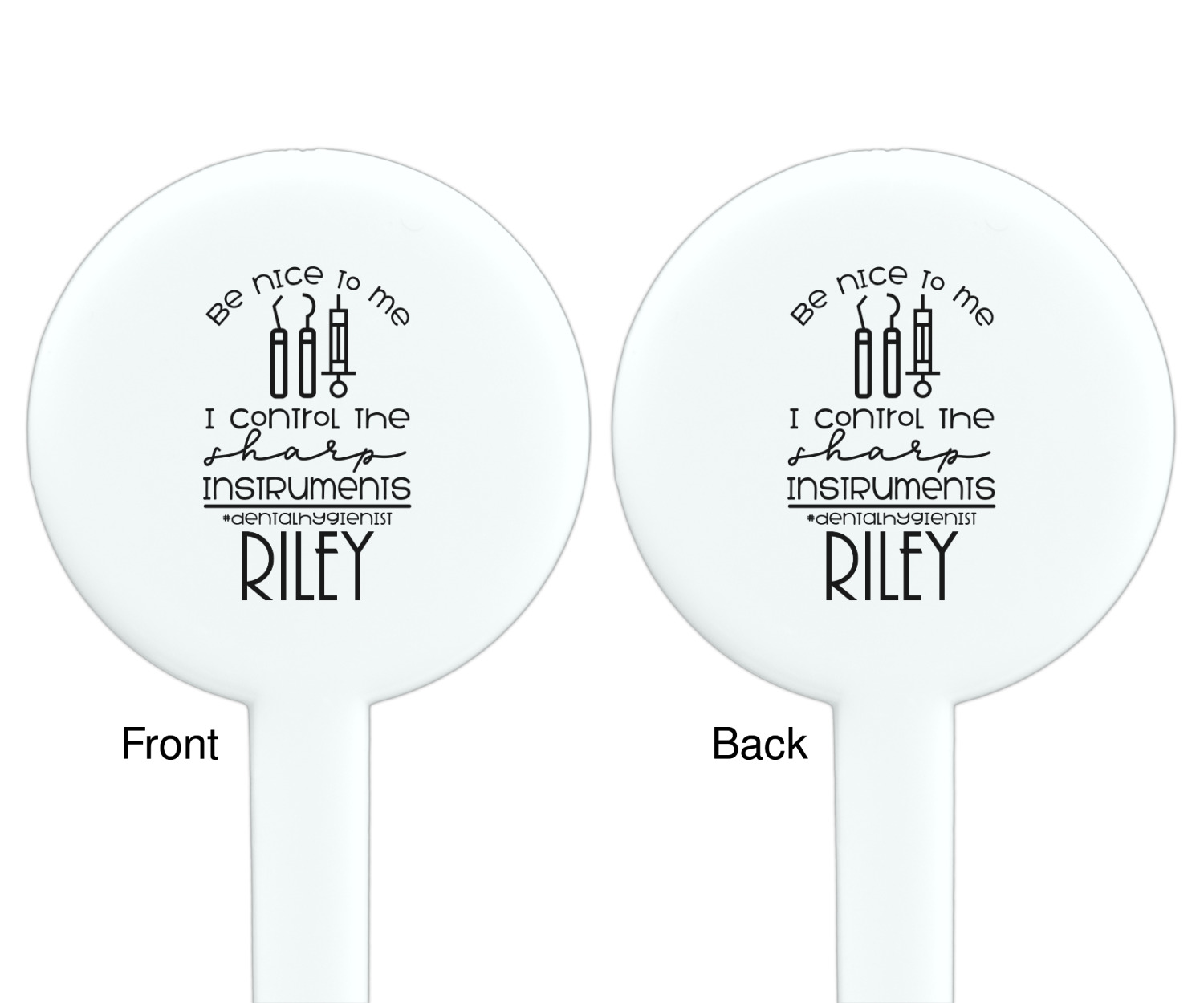 For the foreground, we used a fun quote that says "Be nice to me, I control sharp instruments #dental hygienist"Dental Hygienists bring the sparkle". We chose to personalize it with a name underneath. We used black for our color. You can customize the graphics, the colors as well as the personalization. Enjoy customizing it to make it yours.