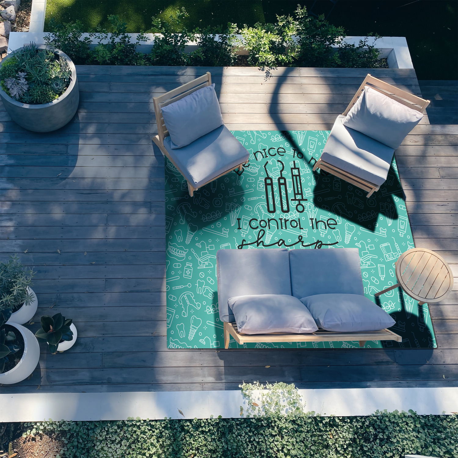 Our custom patio area rugs are velvety soft and smooth, with a short pile, beautiful sewn corners and edges for a refined and exquisite finished look. The poly chenille face is printed with your design and is sure to brighten up any room with its fabulous look. They have just enough cushion to feel comfortable under foot but not soak up water in the weather and offer a quick drying material.
