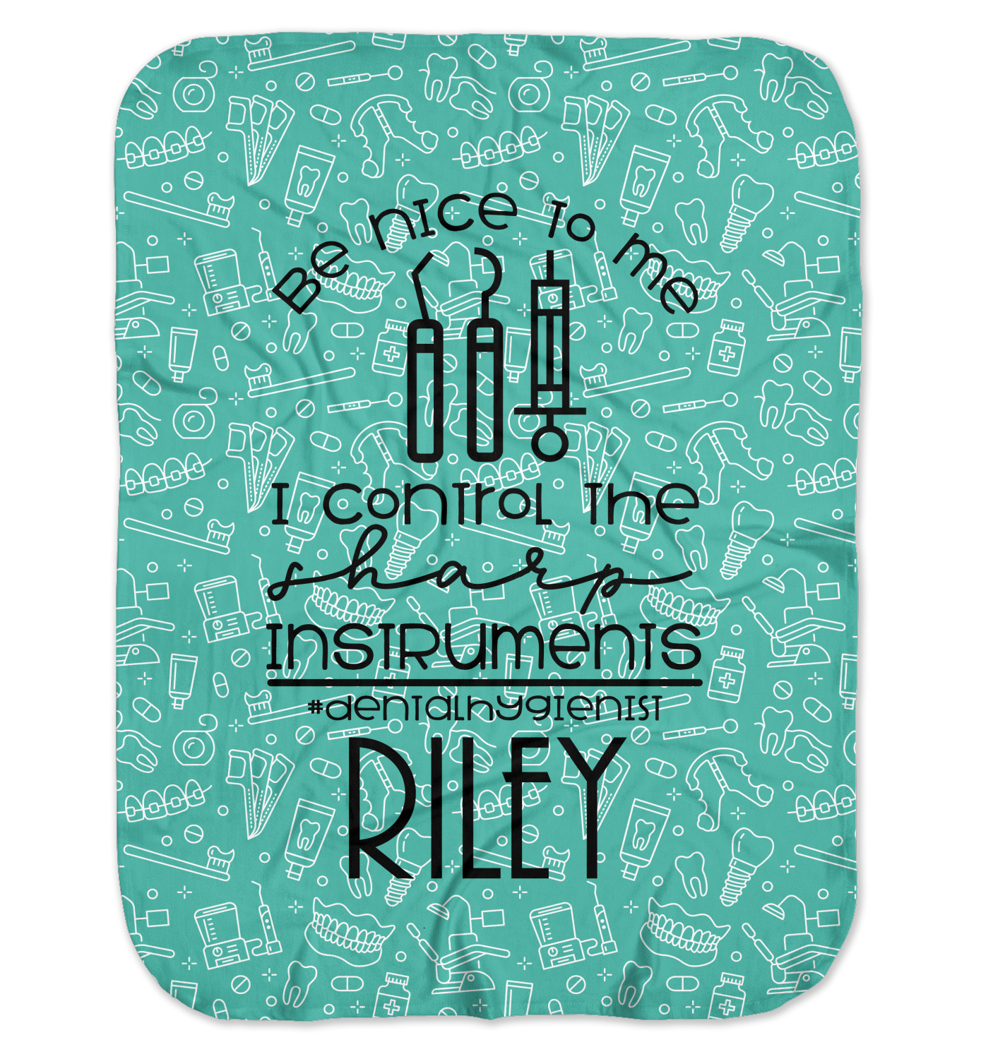 For the foreground, we used a fun quote that says "Be nice to me, I control sharp instruments #dental hygienist"Dental Hygienists bring the sparkle". We chose to personalize it with a name underneath. We used black for our color. You can customize the graphics, the colors as well as the personalization. Enjoy customizing it to make it yours.
