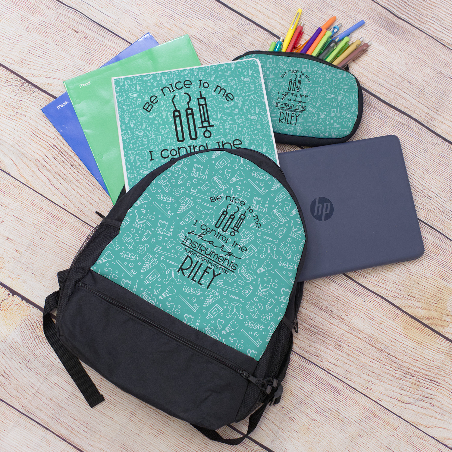 We choose a scrubs green background with line drawings of dental instruments in white. Both colors can be customized. We also have other dental themed backgrounds and hundreds of fun patterns that can easily be swapped out.