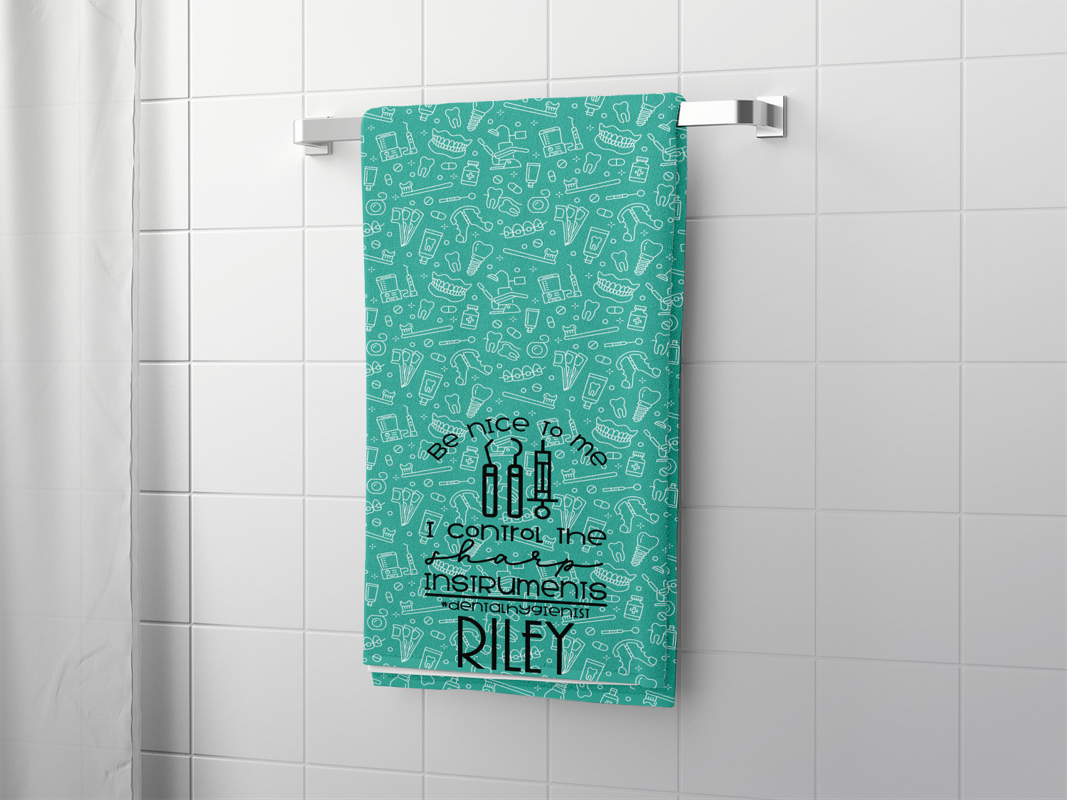 For the foreground, we used a fun quote that says "Be nice to me, I control sharp instruments #dental hygienist"Dental Hygienists bring the sparkle". We chose to personalize it with a name underneath. We used black for our color. You can customize the graphics, the colors as well as the personalization. Enjoy customizing it to make it yours.