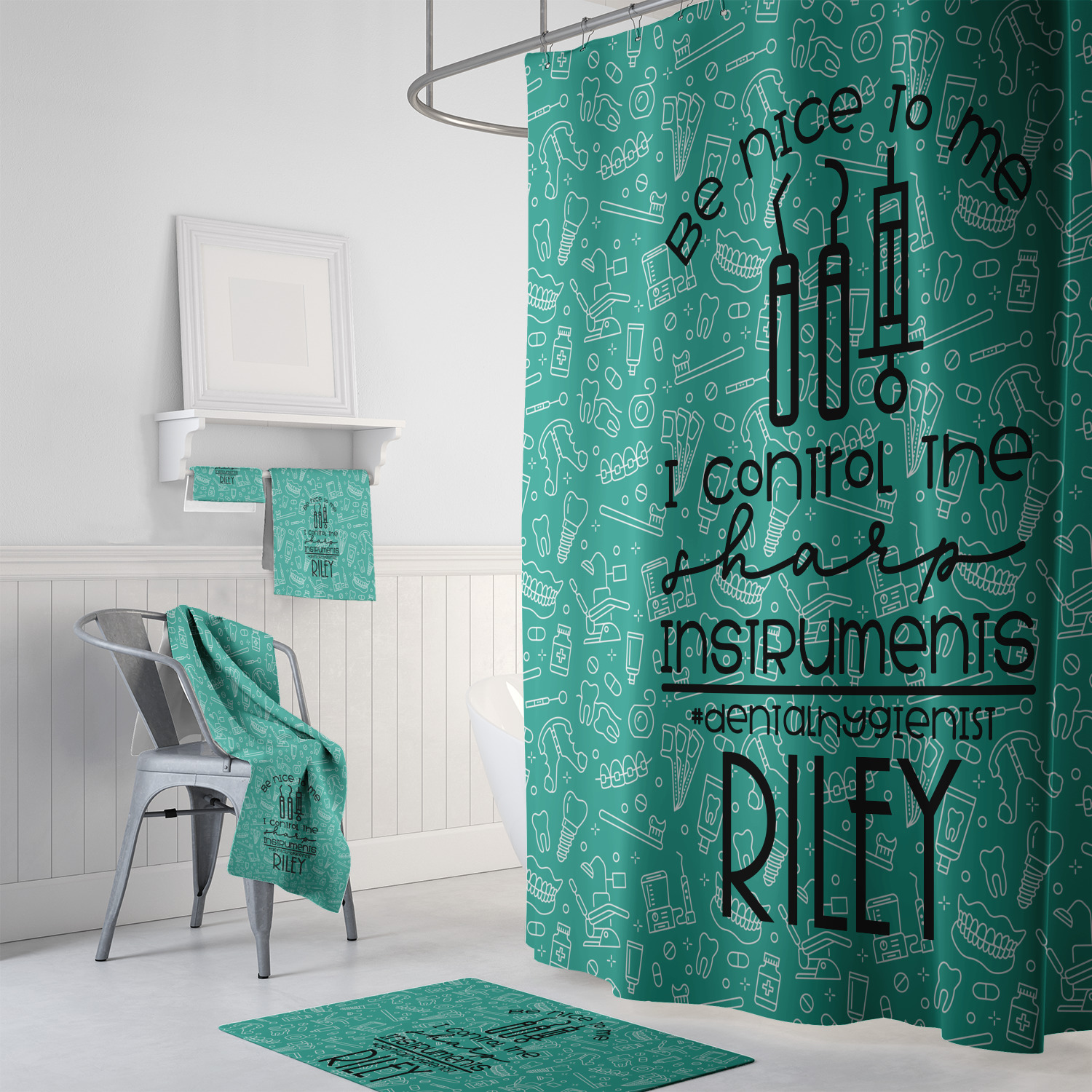 For the foreground, we used a fun quote that says "Be nice to me, I control sharp instruments #dental hygienist"Dental Hygienists bring the sparkle". We chose to personalize it with a name underneath. We used black for our color. You can customize the graphics, the colors as well as the personalization. Enjoy customizing it to make it yours.
