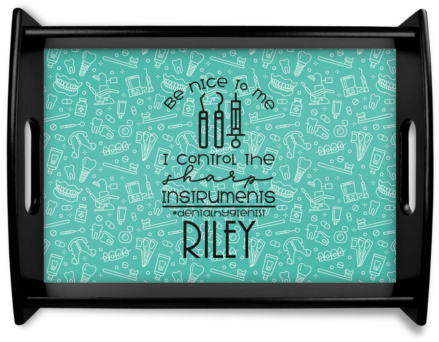 For the foreground, we used a fun quote that says "Be nice to me, I control sharp instruments #dental hygienist"Dental Hygienists bring the sparkle". We chose to personalize it with a name underneath. We used black for our color. You can customize the graphics, the colors as well as the personalization. Enjoy customizing it to make it yours.