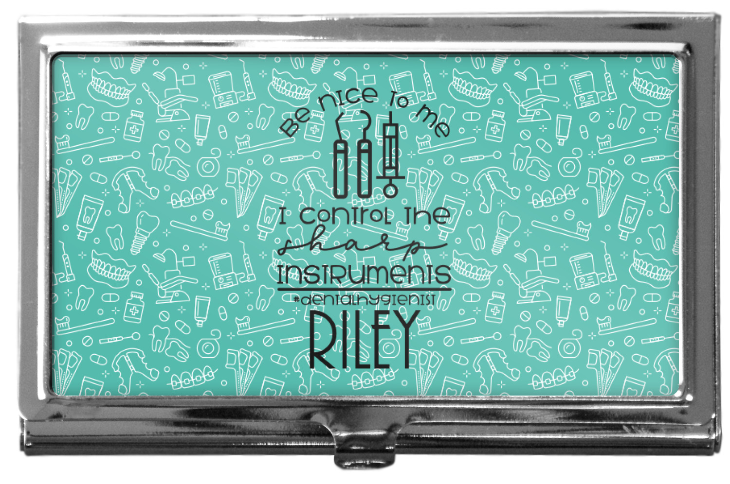 For the foreground, we used a fun quote that says "Be nice to me, I control sharp instruments #dental hygienist"Dental Hygienists bring the sparkle". We chose to personalize it with a name underneath. We used black for our color. You can customize the graphics, the colors as well as the personalization. Enjoy customizing it to make it yours.