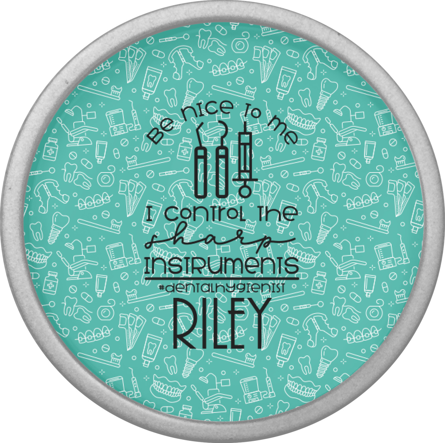 For the foreground, we used a fun quote that says "Be nice to me, I control sharp instruments #dental hygienist"Dental Hygienists bring the sparkle". We chose to personalize it with a name underneath. We used black for our color. You can customize the graphics, the colors as well as the personalization. Enjoy customizing it to make it yours.