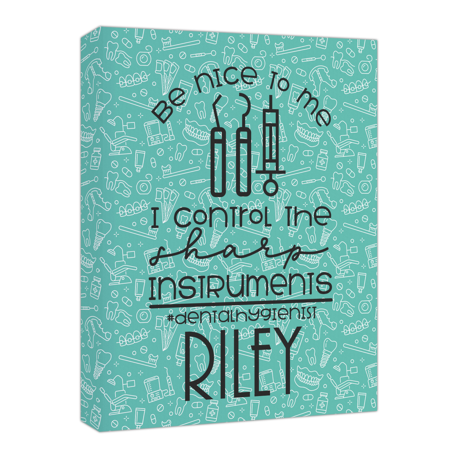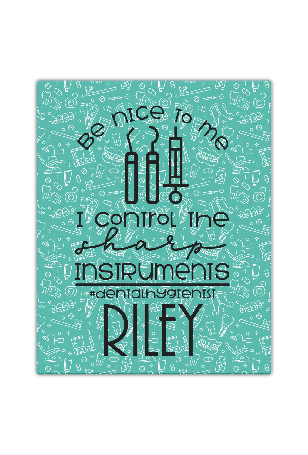 For the foreground, we used a fun quote that says "Be nice to me, I control sharp instruments #dental hygienist"Dental Hygienists bring the sparkle". We chose to personalize it with a name underneath. We used black for our color. You can customize the graphics, the colors as well as the personalization. Enjoy customizing it to make it yours.