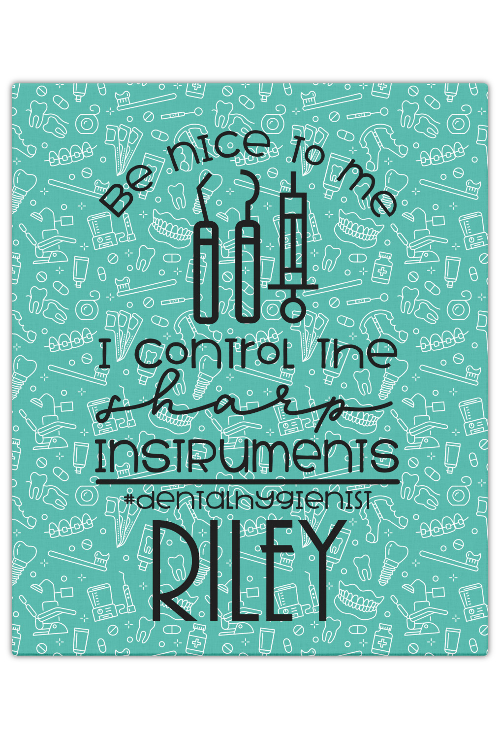 For the foreground, we used a fun quote that says "Be nice to me, I control sharp instruments #dental hygienist"Dental Hygienists bring the sparkle". We chose to personalize it with a name underneath. We used black for our color. You can customize the graphics, the colors as well as the personalization. Enjoy customizing it to make it yours.