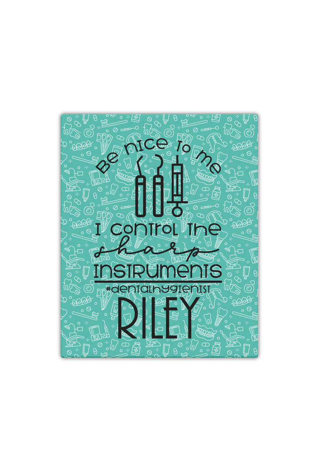 For the foreground, we used a fun quote that says "Be nice to me, I control sharp instruments #dental hygienist"Dental Hygienists bring the sparkle". We chose to personalize it with a name underneath. We used black for our color. You can customize the graphics, the colors as well as the personalization. Enjoy customizing it to make it yours.