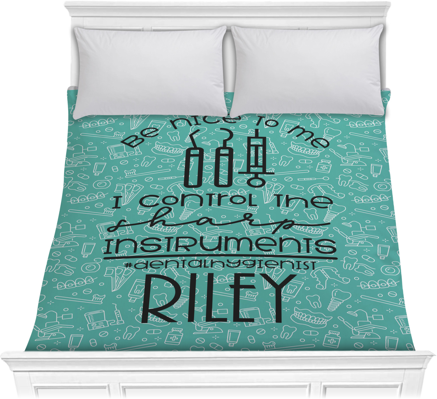 For the foreground, we used a fun quote that says "Be nice to me, I control sharp instruments #dental hygienist"Dental Hygienists bring the sparkle". We chose to personalize it with a name underneath. We used black for our color. You can customize the graphics, the colors as well as the personalization. Enjoy customizing it to make it yours.