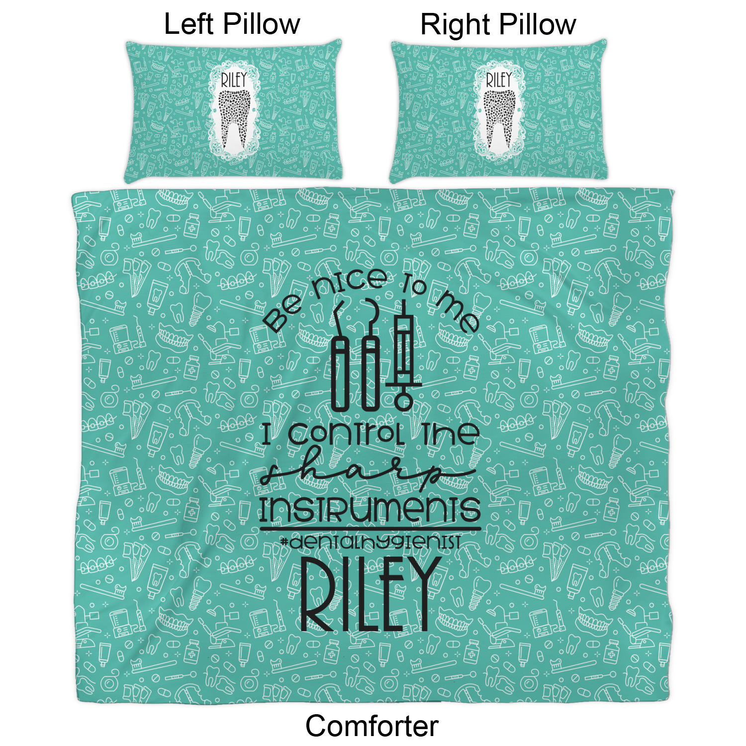 For the foreground, we used a fun quote that says "Be nice to me, I control sharp instruments #dental hygienist"Dental Hygienists bring the sparkle". We chose to personalize it with a name underneath. We used black for our color. You can customize the graphics, the colors as well as the personalization. Enjoy customizing it to make it yours.
