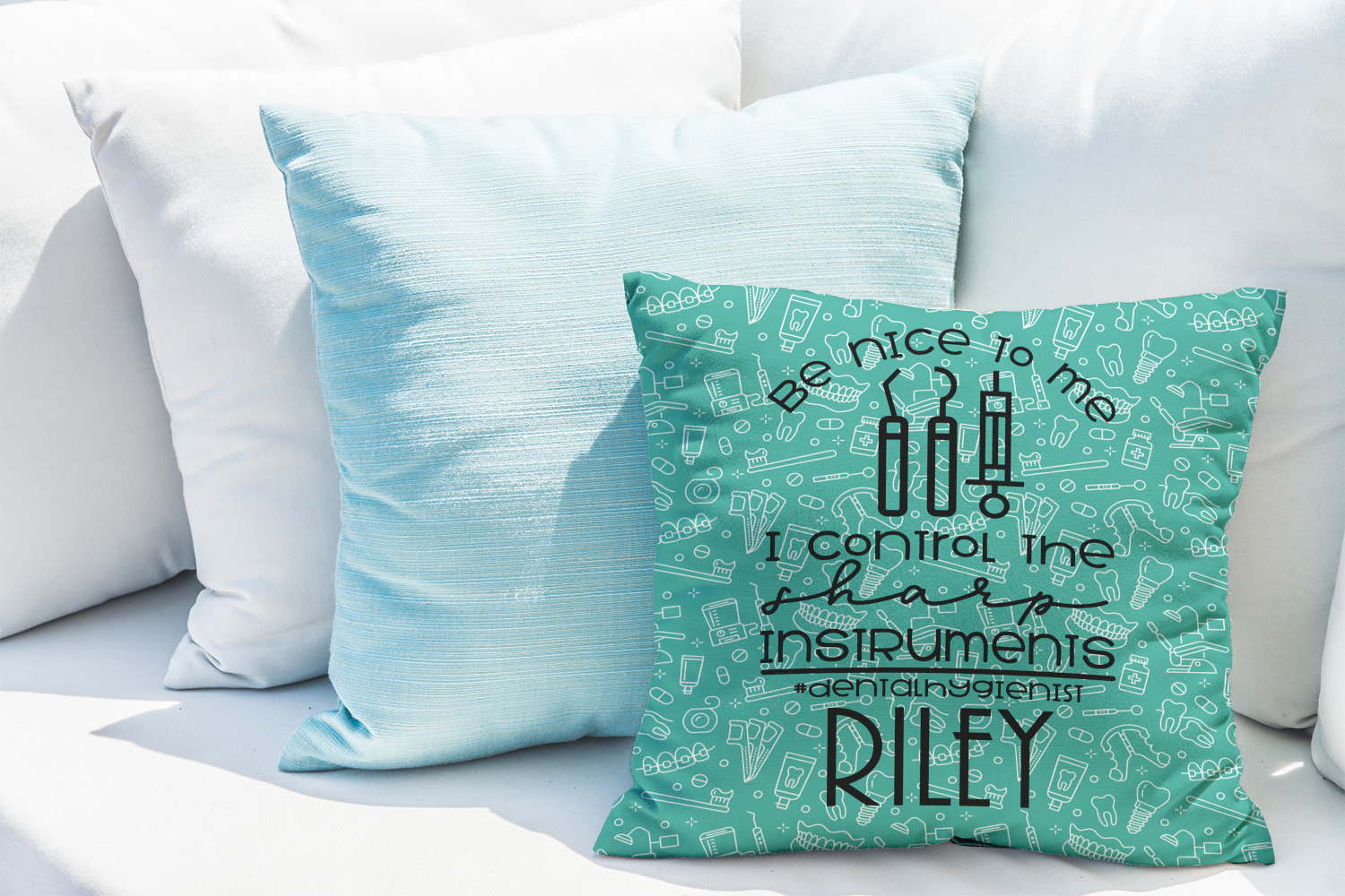 For the foreground, we used a fun quote that says "Be nice to me, I control sharp instruments #dental hygienist"Dental Hygienists bring the sparkle". We chose to personalize it with a name underneath. We used black for our color. You can customize the graphics, the colors as well as the personalization. Enjoy customizing it to make it yours.