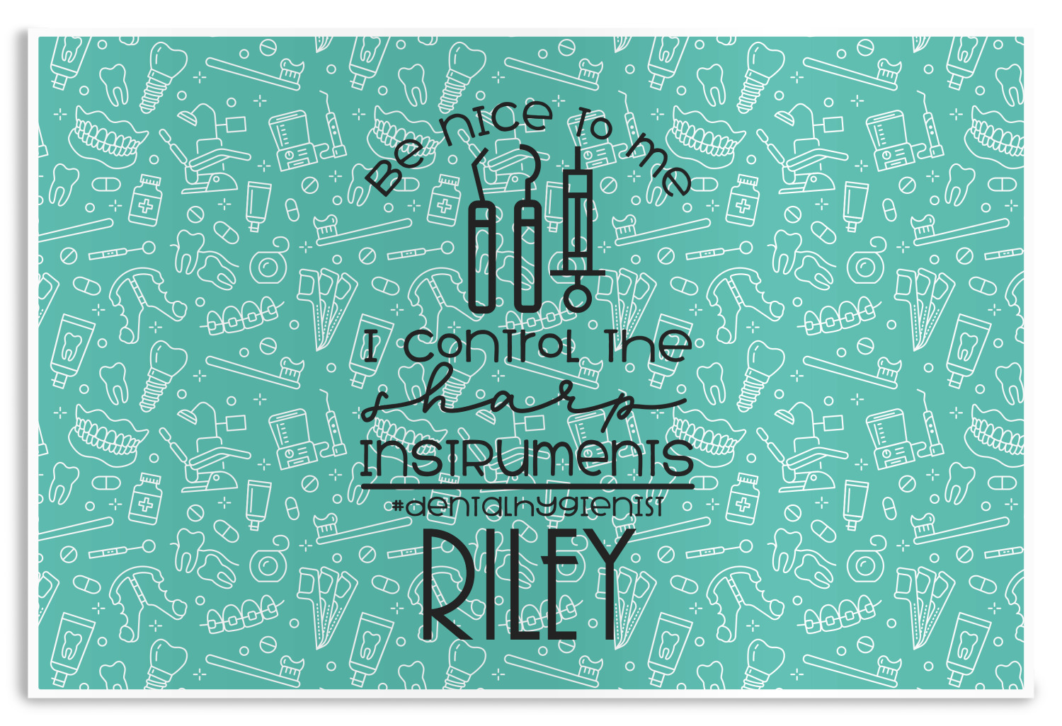 For the foreground, we used a fun quote that says "Be nice to me, I control sharp instruments #dental hygienist"Dental Hygienists bring the sparkle". We chose to personalize it with a name underneath. We used black for our color. You can customize the graphics, the colors as well as the personalization. Enjoy customizing it to make it yours.