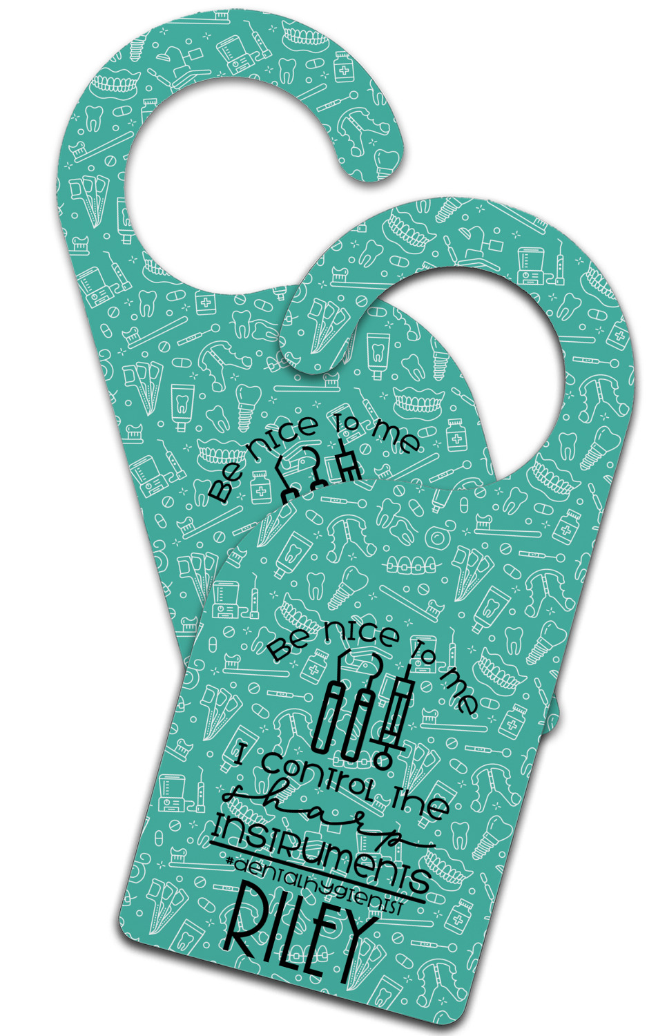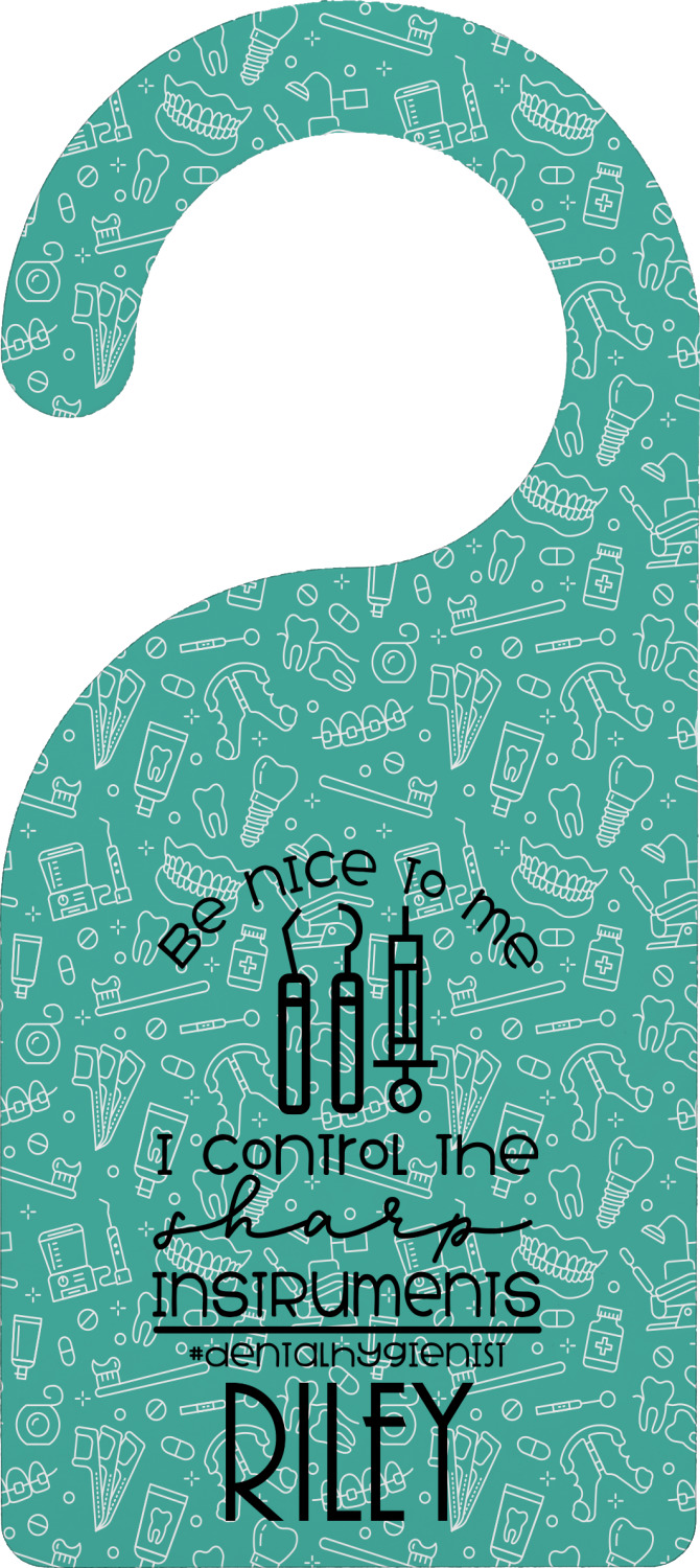 For the foreground, we used a fun quote that says "Be nice to me, I control sharp instruments #dental hygienist"Dental Hygienists bring the sparkle". We chose to personalize it with a name underneath. We used black for our color. You can customize the graphics, the colors as well as the personalization. Enjoy customizing it to make it yours.