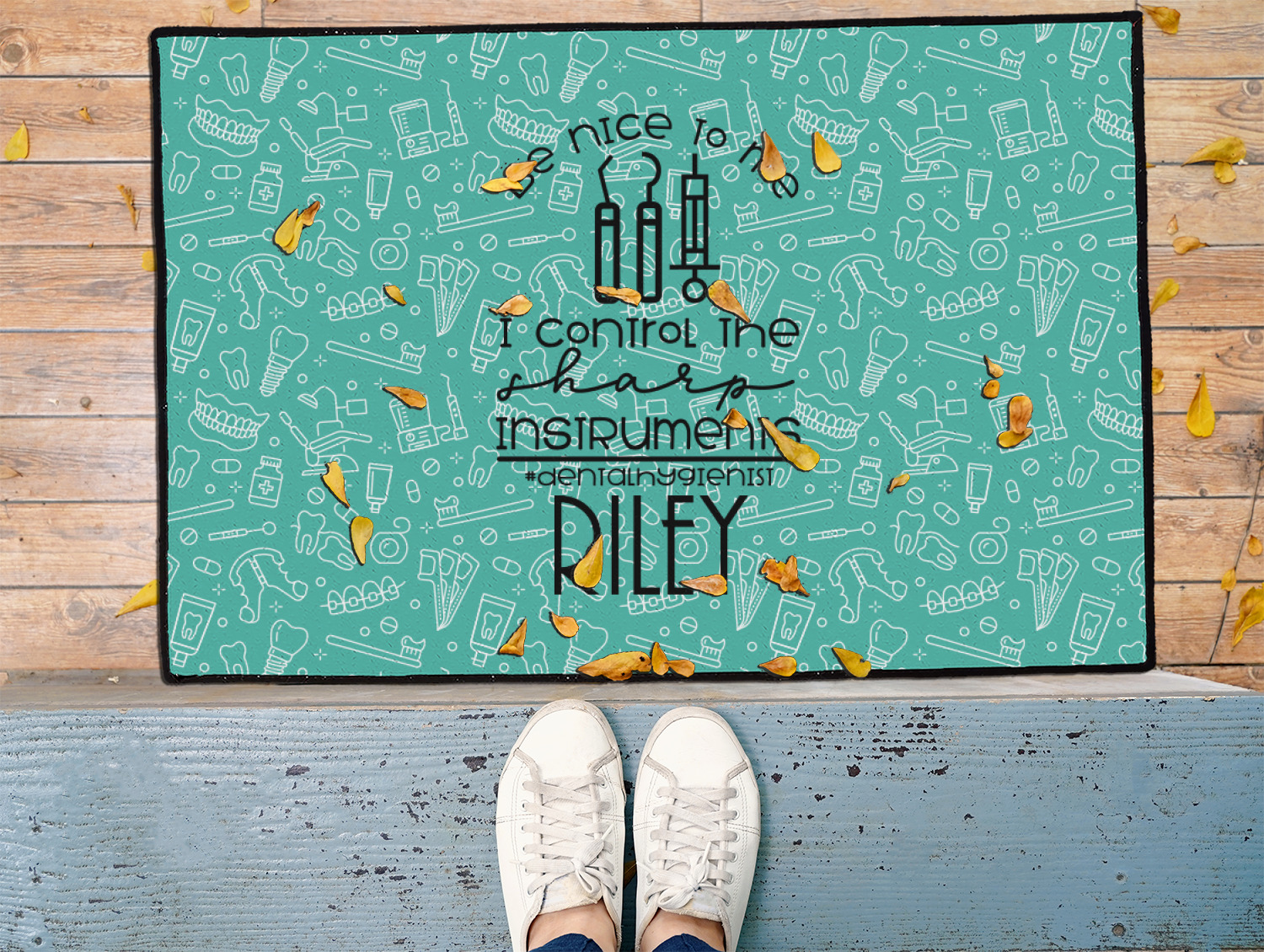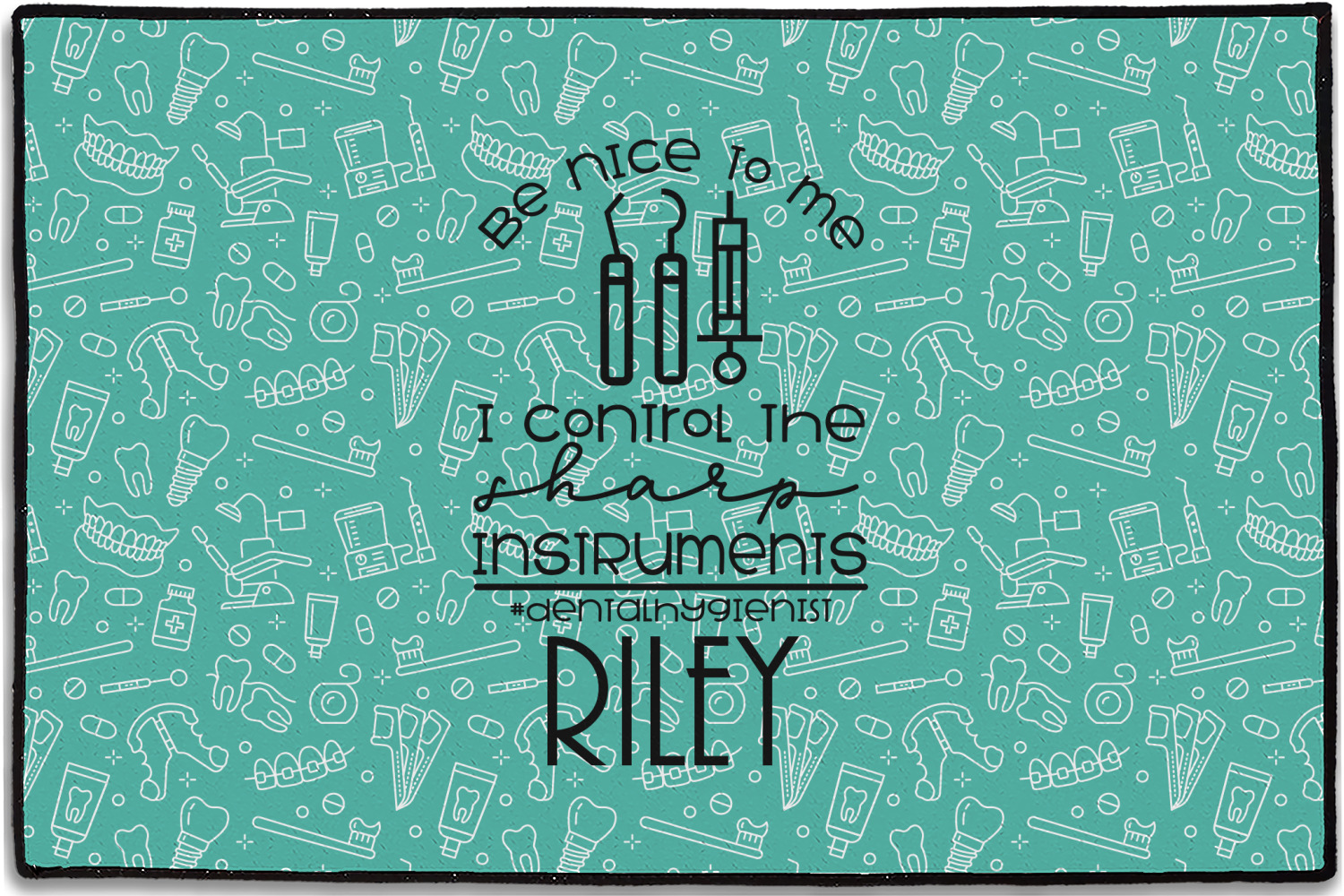 For the foreground, we used a fun quote that says "Be nice to me, I control sharp instruments #dental hygienist"Dental Hygienists bring the sparkle". We chose to personalize it with a name underneath. We used black for our color. You can customize the graphics, the colors as well as the personalization. Enjoy customizing it to make it yours.