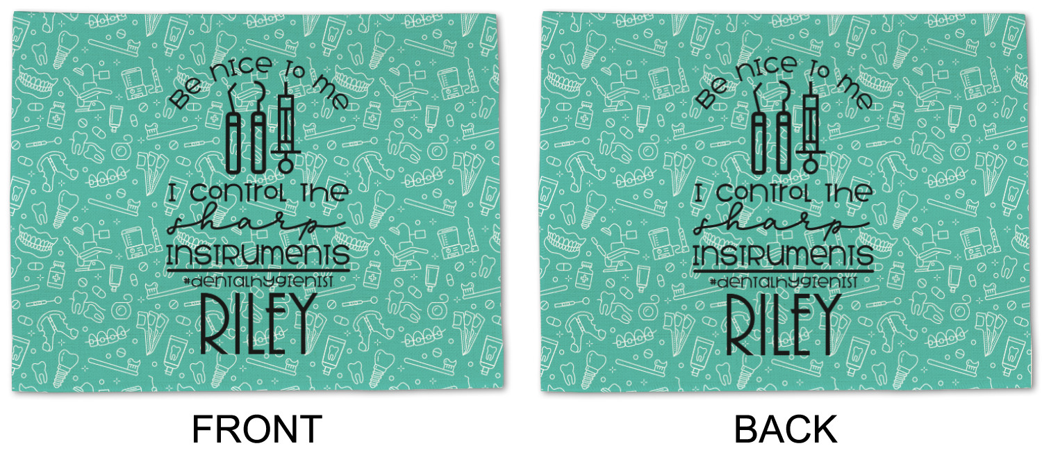 We choose a scrubs green background with line drawings of dental instruments in white. Both colors can be customized. We also have other dental themed backgrounds and hundreds of fun patterns that can easily be swapped out.