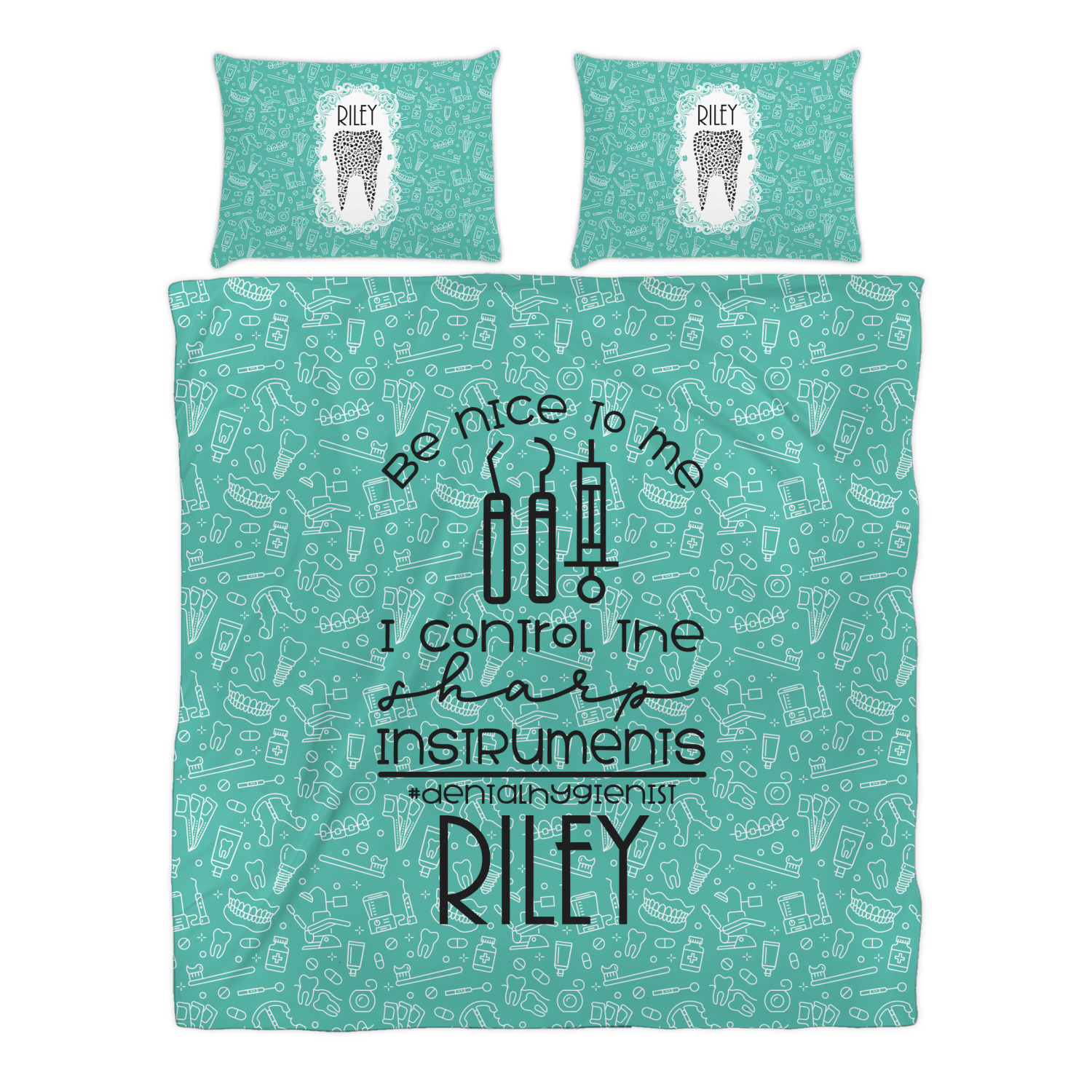 For the foreground, we used a fun quote that says "Be nice to me, I control sharp instruments #dental hygienist"Dental Hygienists bring the sparkle". We chose to personalize it with a name underneath. We used black for our color. You can customize the graphics, the colors as well as the personalization. Enjoy customizing it to make it yours.