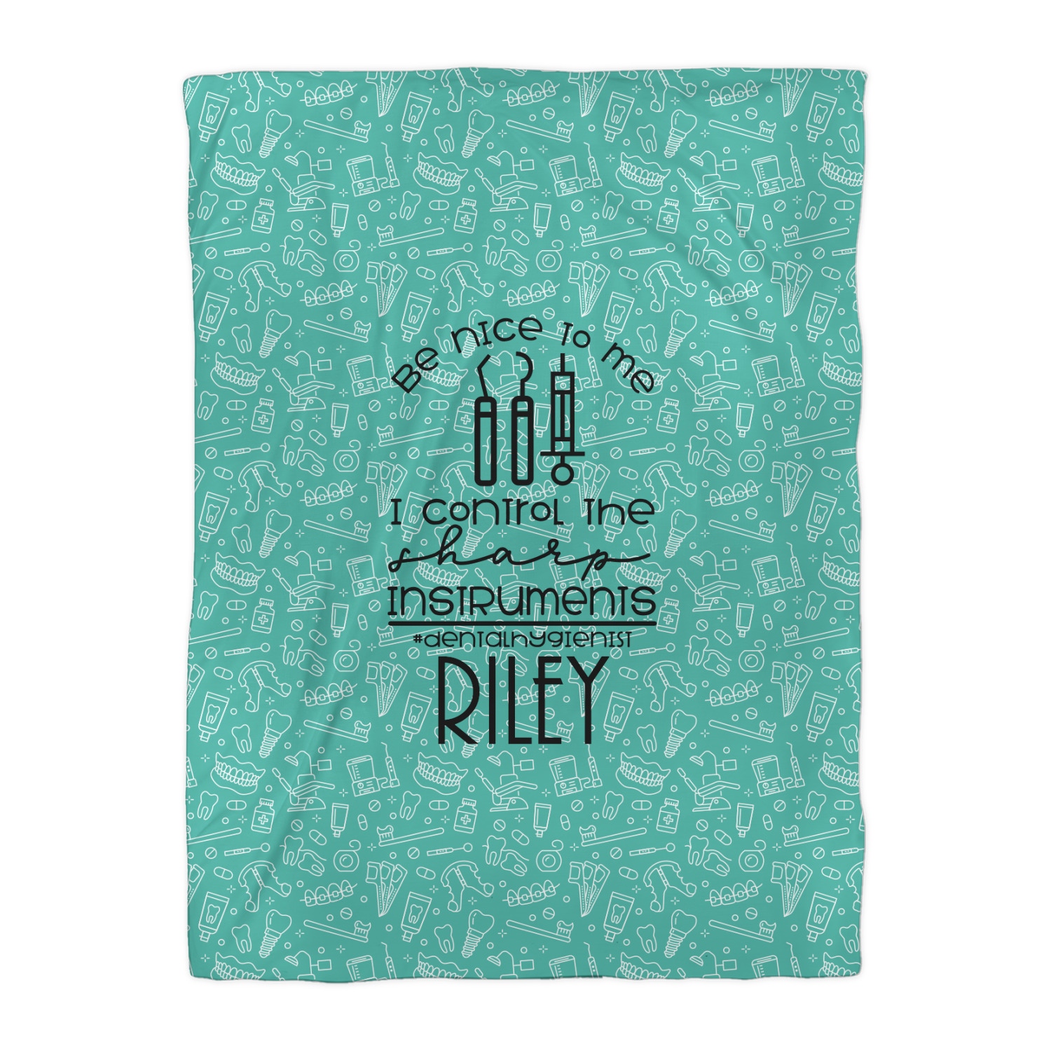 For the foreground, we used a fun quote that says "Be nice to me, I control sharp instruments #dental hygienist"Dental Hygienists bring the sparkle". We chose to personalize it with a name underneath. We used black for our color. You can customize the graphics, the colors as well as the personalization. Enjoy customizing it to make it yours.