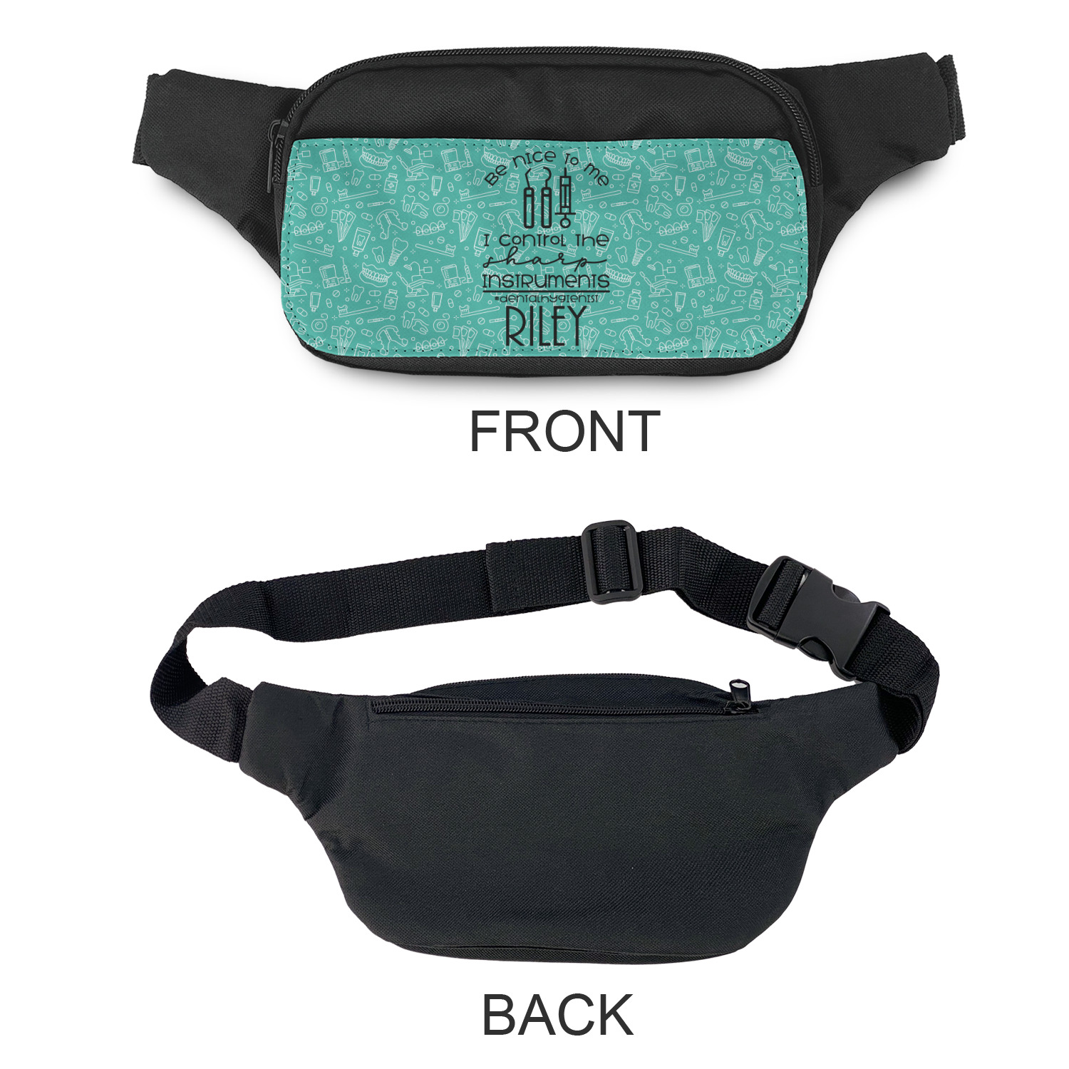 This is a unisex fanny pack - suitable for both men & women. The front flap is printed in full color with your design. You can add a photo, logo or any image that you would like. We offer a number of design templates that can be customized by you to your liking.