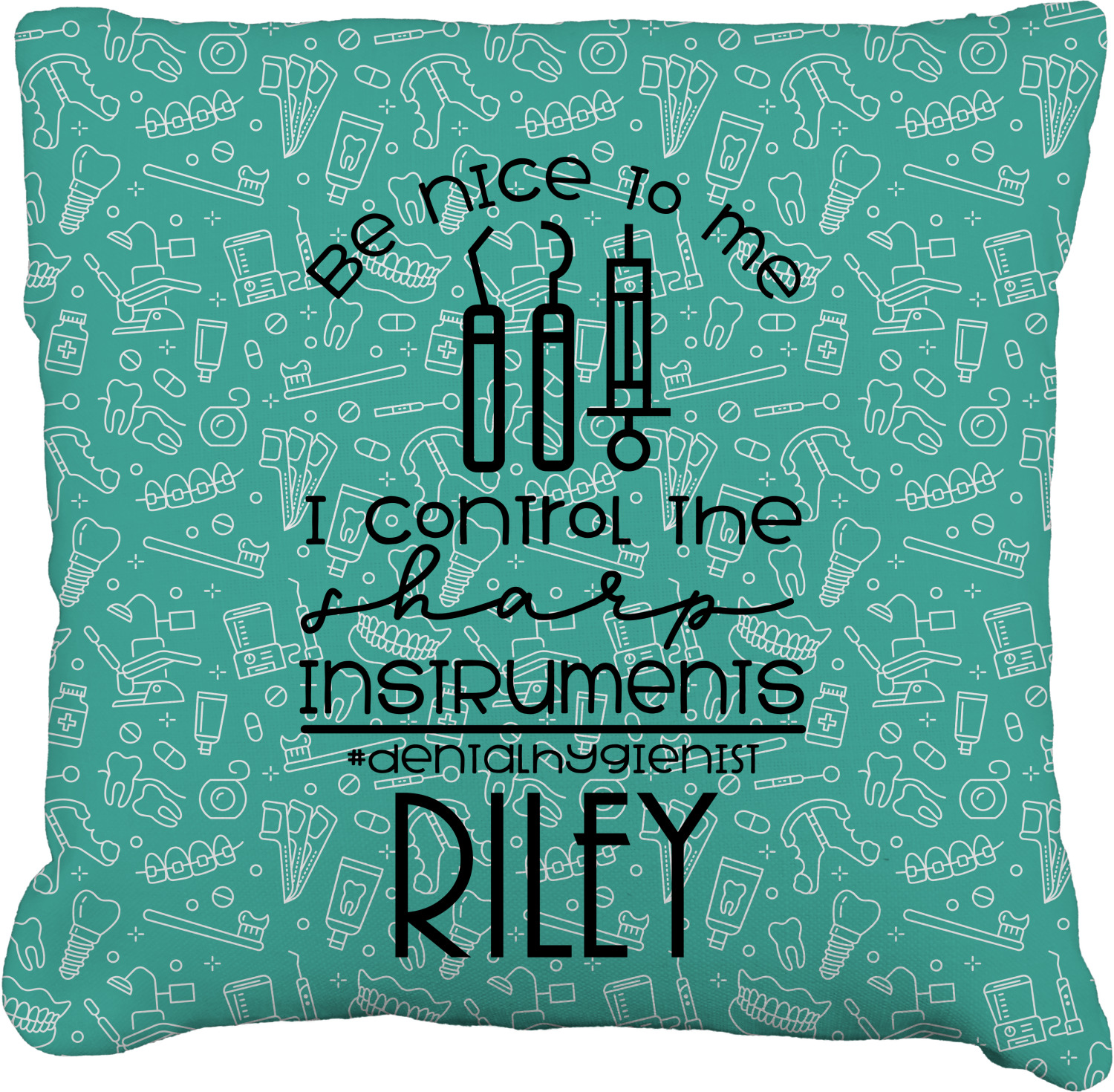 For the foreground, we used a fun quote that says "Be nice to me, I control sharp instruments #dental hygienist"Dental Hygienists bring the sparkle". We chose to personalize it with a name underneath. We used black for our color. You can customize the graphics, the colors as well as the personalization. Enjoy customizing it to make it yours.