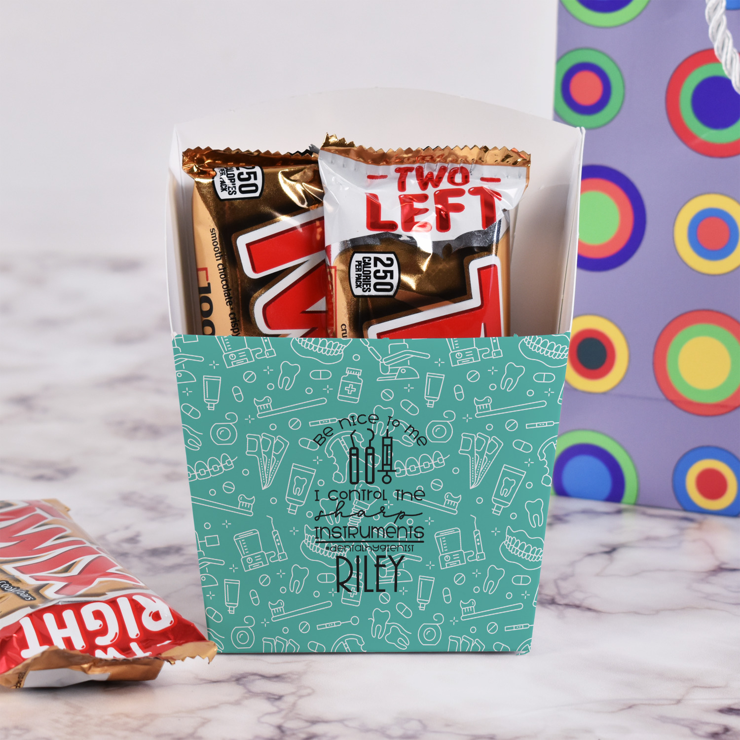 These french fry favor boxes are a pretty good size i.e. 5.25" tall x 4.25" wide x 1..625" deep. If you are not good with dimensions - it easily fits 2 full size Twix bars, or it is the size of McDonald's large fries.