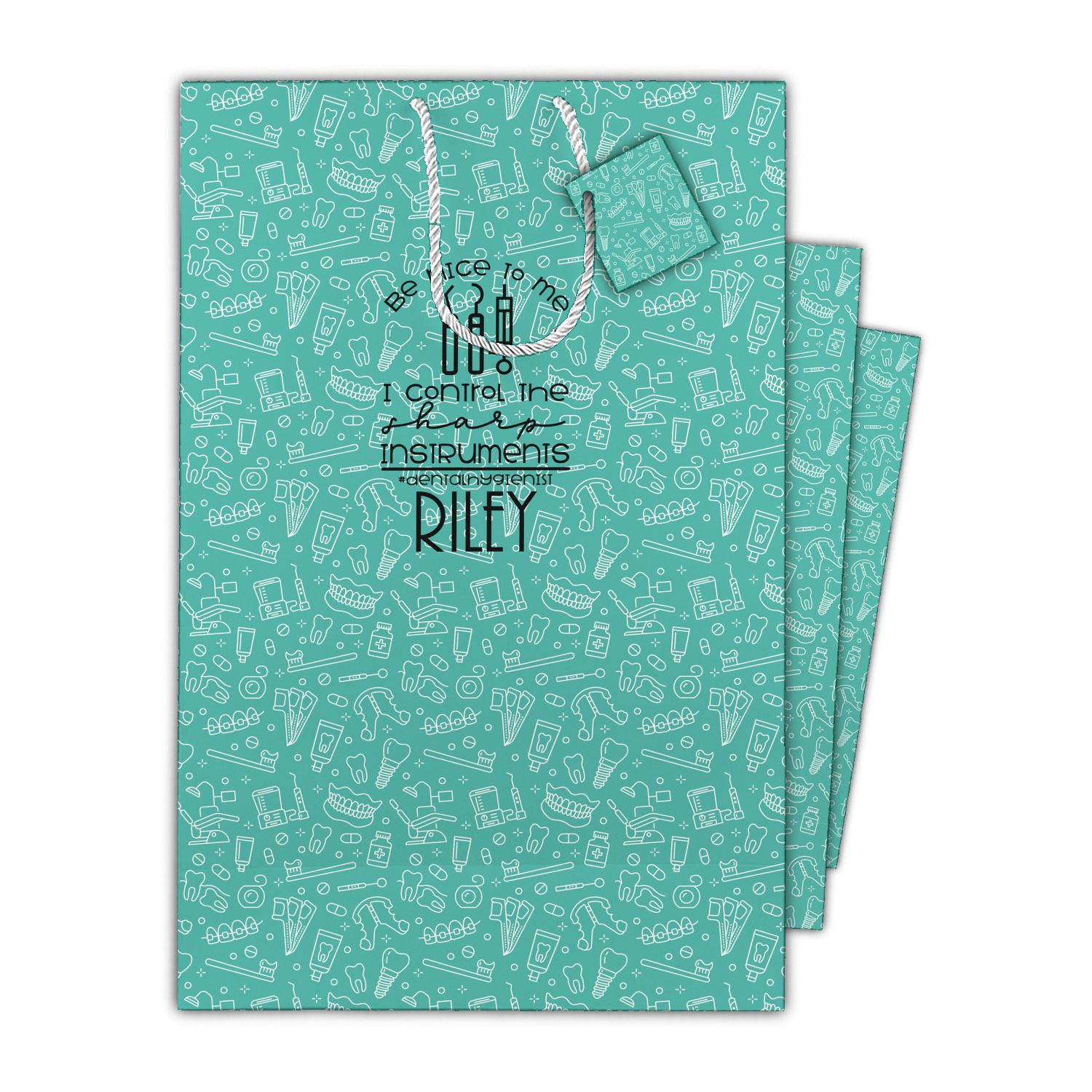 We choose a scrubs green background with line drawings of dental instruments in white. Both colors can be customized. We also have other dental themed backgrounds and hundreds of fun patterns that can easily be swapped out.